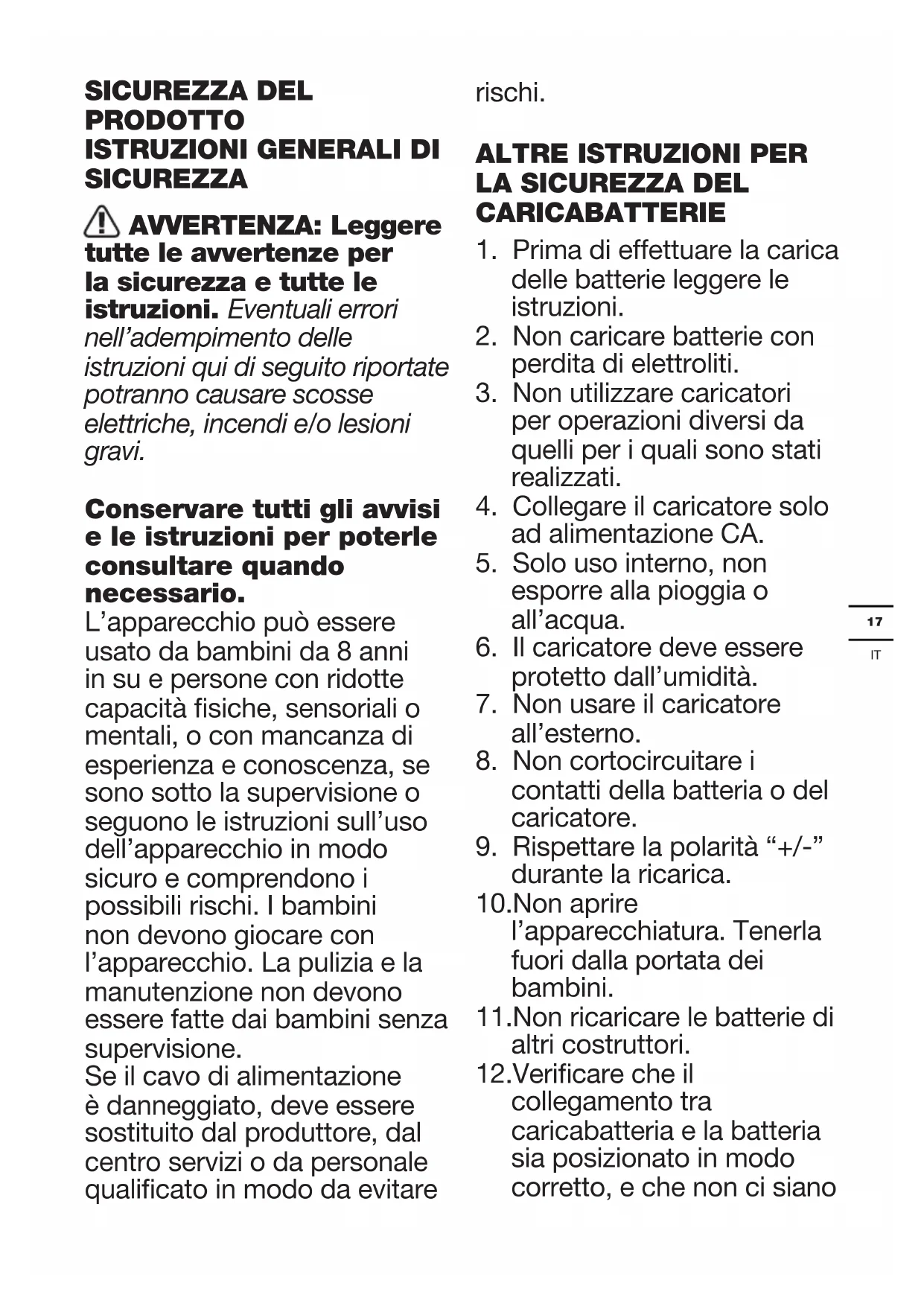 SICUREZZA AVVERTENZA: Leggere tutte le avvertenze per la sicurezza e tutte le istruzioni. Eventuali errori nell’adempimento delle istruzioni qui di seguito riportate potranno causare scosse elettriche, incendi e/o lesioni gravi. Conservare tutti gli avvisi e le istruzioni per poterle consultare quando necessario. L’apparecchio può essere usato da bambini da 8 anni in su e persone con ridotte capacità siche, sensoriali o mentali, o con mancanza di esperienza e conoscenza, se sono sotto la supervisione o seguono le istruzioni sull’uso dell’apparecchio in modo sicuro e comprendono i possibili rischi. I bambini non devono giocare con l’apparecchio. La pulizia e la manutenzione non devono essere fatte dai bambini senza supervisione. Se il cavo di alimentazione è danneggiato, deve essere sostituito dal produttore, dal centro servizi o da personale qualicato in modo da evitare rischi.