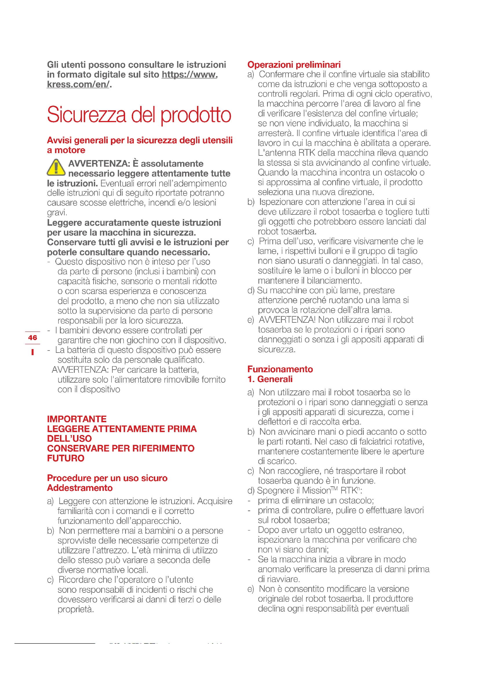 Gli utenti possono consultare le istruzioni in formato digitale sul sito https://www. kress.com/en/. Sicurezza del prodotto Avvisi generali per la sicurezza degli utensili a motore AVVERTENZA: È assolutamente necessario leggere attentamente tutte le istruzioni. Eventuali errori nell’adempimento delle istruzioni qui di seguito riportate potranno causare scosse elettriche, incendi e/o lesioni gravi. Leggere accuratamente queste istruzioni per usare la macchina in sicurezza. Conservare tutti gli avvisi e le istruzioni per poterle consultare quando necessario. - Questo dispositivo non è inteso per l’uso da parte di persone (inclusi i bambini) con capacità fisiche, sensorie o mentali ridotte o con scarsa esperienza e conoscenza del prodotto, a meno che non sia utilizzato sotto la supervisione da parte di persone responsabili per la loro sicurezza. - I bambini devono essere controllati per garantire che non giochino con il dispositivo. - La batteria di questo dispositivo può essere sostituita solo da personale qualificato. AVVERTENZA: Per caricare la batteria, utilizzare solo l'alimentatore rimovibile fornito con il dispositivo IMPORTANTE