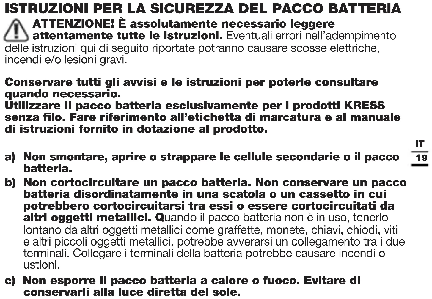 ISTRUZIONI PER LA SICUREZZA DEL PACCO BATTERIA ATTENZIONE! È assolutamente necessario leggere attentamente tutte le istruzioni. Eventuali errori nell’adempimento delle istruzioni qui di seguito riportate potranno causare scosse elettriche, incendi e/o lesioni gravi. Conservare tutti gli avvisi e le istruzioni per poterle consultare quando necessario. Utilizzare il pacco batteria esclusivamente per i prodotti KRESS senza filo. Fare riferimento all’etichetta di marcatura e al manuale di istruzioni fornito in dotazione al prodotto.