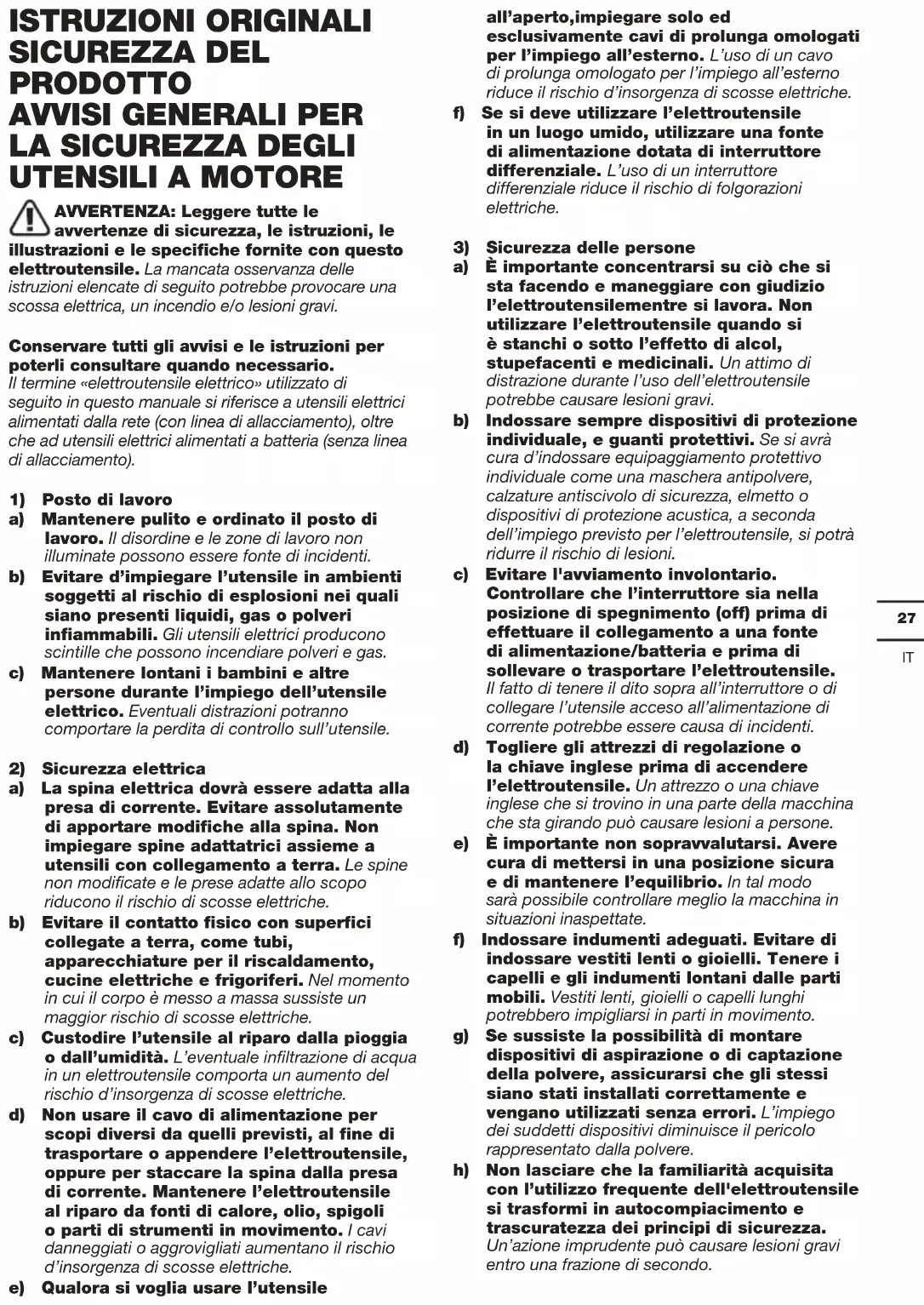 AVVERTENZA: Leggere tutte le avvertenze di sicurezza, le istruzioni, le illustrazioni e le specifiche fornite con questo elettroutensile. La mancata osservanza delle istruzioni elencate di seguito potrebbe provocare una scossa elettrica, un incendio e/o lesioni gravi. Conservare tutti gli avvisi e le istruzioni per poterli consultare quando necessario. Il termine «elettroutensile elettrico» utilizzato di seguito in questo manuale si riferisce a utensili elettrici alimentati dalla rete (con linea di allacciamento), oltre che ad utensili elettrici alimentati a batteria (senza linea di allacciamento).