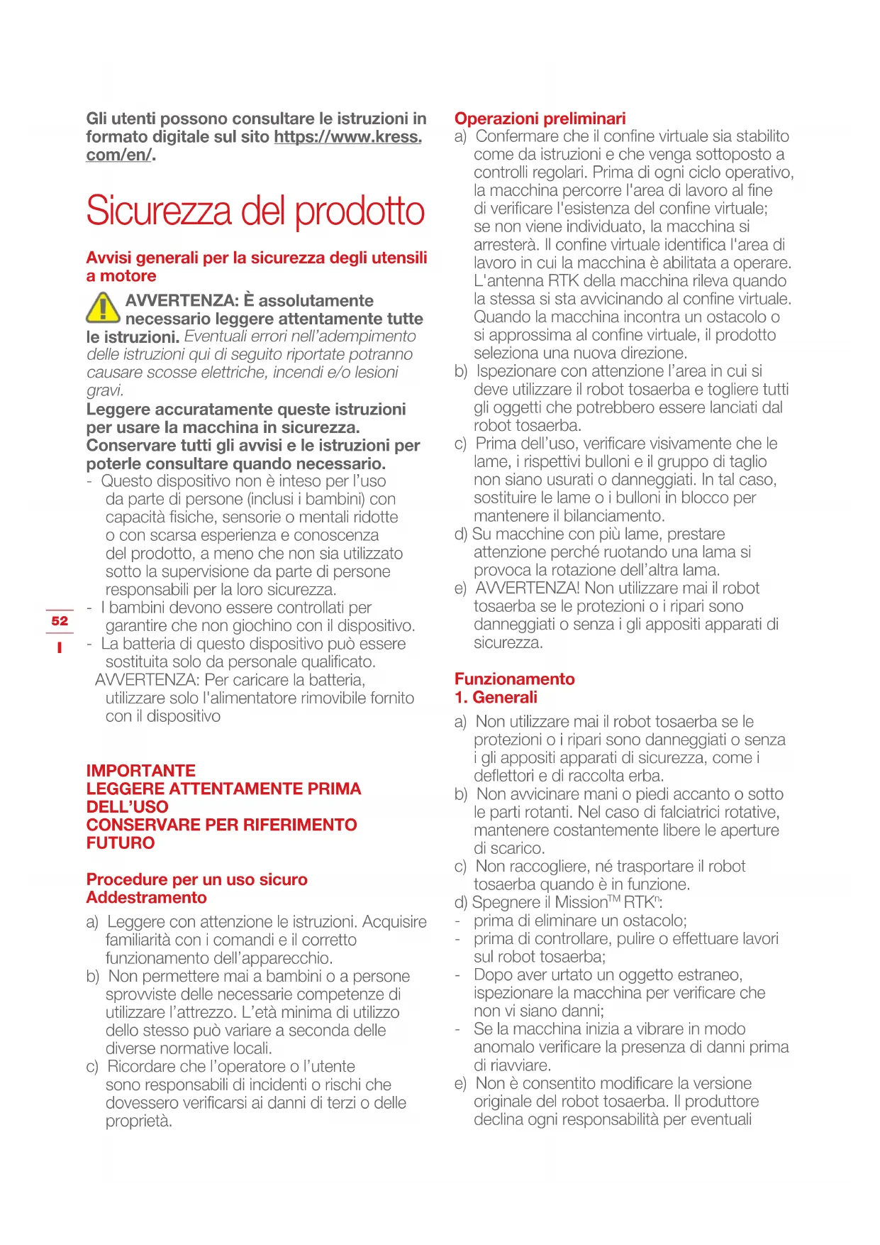 presente sul fondo, nella parte posteriore. Trasportare il robot tosaerba con il disco lame lontano dal corpo. Requisiti di esposizione RF Per soddisfare i requisiti relativi all'esposizione RF, è necessario mantenere una distanza di separazione di almeno 200 mm tra questo dispositivo e le persone durante il funzionamento del dispositivo. Per garantire la conformità, non è consigliabile eseguire operazioni a distanze più ravvicinate. L'antenna utilizzata per questo trasmettitore non deve essere collocata in congiunzione con altre antenne o trasmettitori. Si tratta di un apparecchio di classe III e deve essere alimentato solo a bassissima tensione di sicurezza corrispondente alla marcatura sull’apparecchio. Avvertenze di sicurezza per il pacco batteria all'interno dell'elettroutensile a) Non smontare, aprire o strappare le celle secondarie o il pacco batteria. b) Non mettere in corto circuito il pacco batteria. Non conservare il pacco batteria disordinatamente in una scatola o in un cassetto in cui potrebbe essere cortocircuitato da altri oggetti metallici. Quando il pacco batteria non è in uso, tenerlo lontano da altri oggetti metallici come graffette, monete, chiavi, chiodi, viti e altri piccoli oggetti metallici, perché potrebbe crearsi un collegamento tra i due terminali. Collegare i terminali della batteria potrebbe causare incendi o ustioni. c) Non esporre il pacco batteria a calore o fuoco. Evitare di conservarlo alla luce diretta del sole. d) Non sottoporre il pacco batteria a scosse meccaniche. e) In caso di perdite da una cellula, evitare che il liquido entri in contatto con la pelle o gli occhi. In caso di contatto, lavare l'area interessata con abbondante acqua e consultare un medico. f) Tenere le celle e il pacco batteria puliti e asciutti. g) Ricaricare solo con la base di ricarica fornita da Kress. Non utilizzare caricabatterie diversi da quelli forniti per l'uso specifico con l'apparecchiatura. h) Non utilizzare un pacco batteria non progettato per questo prodotto.