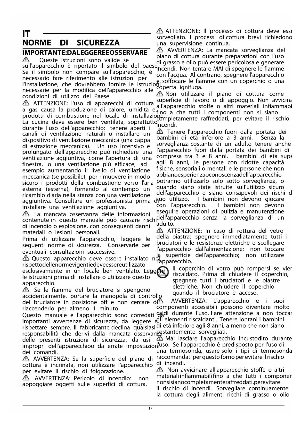 IMPORTANTE:DALEGGEREEOSSERVARE Queste istruzioni sono valide se sull'apparecchio è riportato il simbolo del paese. Se il simbolo non compare sull'apparecchio, è necessario fare riferimento alle istruzioni per l'installazione, che dovrebbero fornire le istruzioni necessarie per la modifica dell'apparecchio alle condizioni di utilizzo del Paese. ATTENZIONE: l'uso di apparecchi di cottura a gas causa la produzione di calore, umidità e prodotti di combustione nel locale di installazione. La cucina deve essere ben ventilata, soprattutto durante l'uso dell'apparecchio: tenere aperti i canali di ventilazione naturali o installare un dispositivo di ventilazione meccanica (una cappa di estrazione meccanica). Un uso intensivo e prolungato dell'apparecchio può richiedere una ventilazione aggiuntiva, come l'apertura di una finestra, o una ventilazione più efficace, ad esempio aumentando il livello di ventilazione meccanica (se possibile), per rimuovere in modo sicuro i prodotti della combustione verso l'aria esterna (esterna), fornendo al contempo un ricambio d'aria nella stanza con una ventilazione aggiuntiva. Consultare un professionista prima di installare una ventilazione aggiuntiva. La mancata osservanza delle informazioni contenute in questo manuale può causare rischi di incendio o esplosione, con conseguenti danni materiali o lesioni personali. Prima di utilizzare l'apparecchio, leggere le seguenti norme di sicurezza. Conservarle per eventuali consultazioni successive. Questo apparecchio deve essere installato nel rispettodellenormevigentiedeveessereutilizzato esclusivamente in un locale ben ventilato. Leggere le istruzioni prima di installare o utilizzare questo apparecchio. Se le fiamme del bruciatore si spengono accidentalmente, portare la manopola di controllo del bruciatore in posizione off e non cercare di riaccenderlo per almeno 1 minuto. Questo manuale e l'apparecchio sono corredati da importanti avvertenze di sicurezza, da leggere e rispettare sempre. Il fabbricante declina qualsiasi responsabilità che derivi dalla mancata osservanza delle presenti istruzioni di sicurezza, da usi impropri dell'apparecchioo da errate impostazioni dei comandi. AVVERTENZA: Se la superficie del piano di cottura è incrinata, non utilizzare l'apparecchio per evitare il rischio di folgorazione. AVVERTENZA: Pericolo di incendio: non appoggiare oggetti sulle superfici di cottura. ATTENZIONE: Il processo di cottura deve essere sorvegliato. I processi di cottura brevi richiedono una supervisione continua. AVVERTENZA: La mancata sorveglianza del piano di cottura durante preparazioni con l'uso di grasso e olio può essere pericolosa e generare incendi. Non tentare MAI di spegnere le fiamme con l'acqua. Al contrario, spegnere l'apparecchio e soffocare le fiamme con un coperchio o una coperta ignifuga. Non utilizzare il piano di cottura come superficie di lavoro o di appoggio. Non avvicinare all'apparecchio stoffe o altri materiali infiammabili fino a che tutti i componenti non si siano completamente raffreddati, per evitare il rischio di incendi. Tenere l'apparecchio fuori dalla portata dei bambini di età inferiore a 3 anni. Senza la sorveglianza costante di un adulto tenere anche l'apparecchio fuori dalla portata dei bambini di età compresa tra 3 e 8 anni. I bambini di età superiore agli 8 anni, le persone con ridotte capacità fisiche, sensoriali o mentali e le persone che non abbianoesperienzaoconoscenzadell'apparecchio potranno utilizzarlo solo sotto sorveglianza, o quando siano state istruite sull'utilizzo sicuro dell'apparecchio e siano consapevoli dei rischi del suo utilizzo. I bambini non devono giocare con l’apparecchio. I bambini non devono eseguire operazioni di pulizia e manutenzione dell'apparecchio senza la sorveglianza di un adulto. ATTENZIONE: In caso di rottura del vetro della piastra: spegnere immediatamente tutti i bruciatori e le resistenze elettriche e scollegare l'apparecchio dall'alimentazione; non toccare la superficie dell'apparecchio; non utilizzare l'apparecchio. Il coperchio di vetro può rompersi se viene riscaldato. Prima di chiudere il coperchio, spegnere tutti i bruciatori e le piastre elettriche. Non chiudere il coperchio quando il bruciatore è acceso. AVVERTENZA: L'apparecchio e i suoi componenti accessibili possono diventare molto caldi durante l'uso. Fare attenzione a non toccare gli elementi riscaldanti. Tenere lontani i bambini di età inferiore agli 8 anni, a meno che non siano costantemente sorvegliati. Mai lasciare l'apparecchio incustodito durante l'uso. Se l'apparecchio è predisposto per l'uso di una termosonda, usare solo i tipi di termosonda raccomandati per questo fornoper evitare il rischio di incendi. Non avvicinare all'apparecchio stoffe o altri materiali infiammabili fino a che tutti i componenti nonsisianocompletamenteraffreddati,perevitare il rischio di incendi. Sorvegliare continuamente la cottura degli alimenti ricchi di grasso o olio o 17le cotture con aggiunta di alcolici, perché queste preparazioni comportano un rischio di incendio. Usare guanti da forno per estrarre tegami e accessori. Alla fine della cottura, aprire lo sportello con cautela, lasciando defluire gradualmente l'aria o il vapore prima di accedere al vano del forno per evitare possibili rischi di ustioni. Non ostruire le aperture di sfiato dell'aria calda sul lato anteriore del forno per evitare il rischio di incendi. Porre la dovuta attenzione con la porta del forno in posizione abbassata o di apertura, per evitare di urtarla. L'alimento non deve essere lasciato nel o sul prodotto per più di un'ora prima o dopo la cottura. AVVERTENZA: Il gas che fuoriesce può incendiarsi. Il dispositivo non deve essere azionato per più di 15 secondi. Se dopo 15 secondi il bruciatore non è ancora acceso, interrompere l'uso del dispositivo e aprire la porta del comparto e/o attendere almeno 1 minuto prima di riprovare l'accensione. USO CONSENTITO ATTENZIONE: l'apparecchio non è destinato ad 