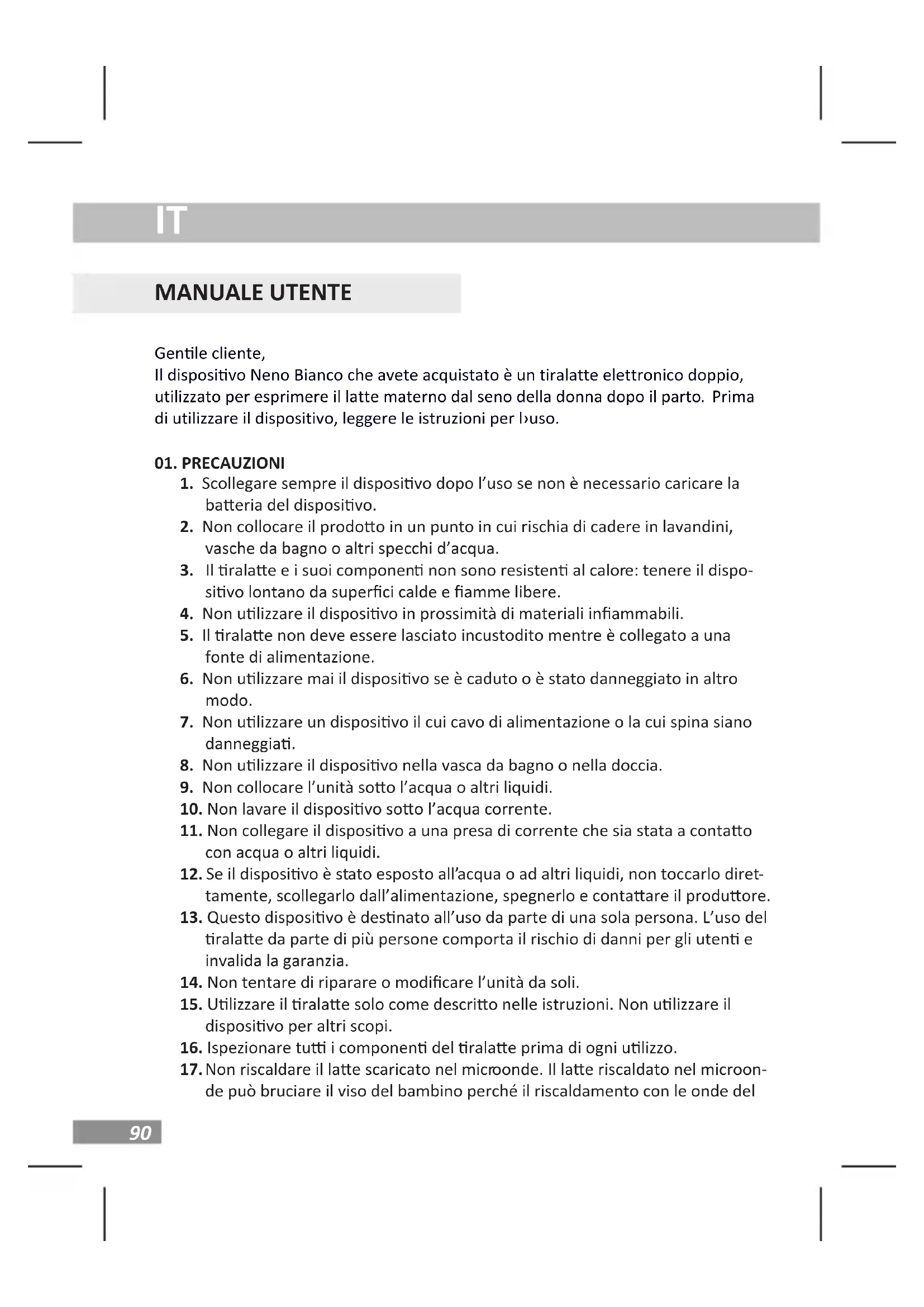 MANUALE UTENTE Genle cliente, Il disposivo Neno Bianco che avete acquistato è un tiralatte elettronico doppio, utilizzato per esprimere il latte materno dal seno della donna dopo il parto