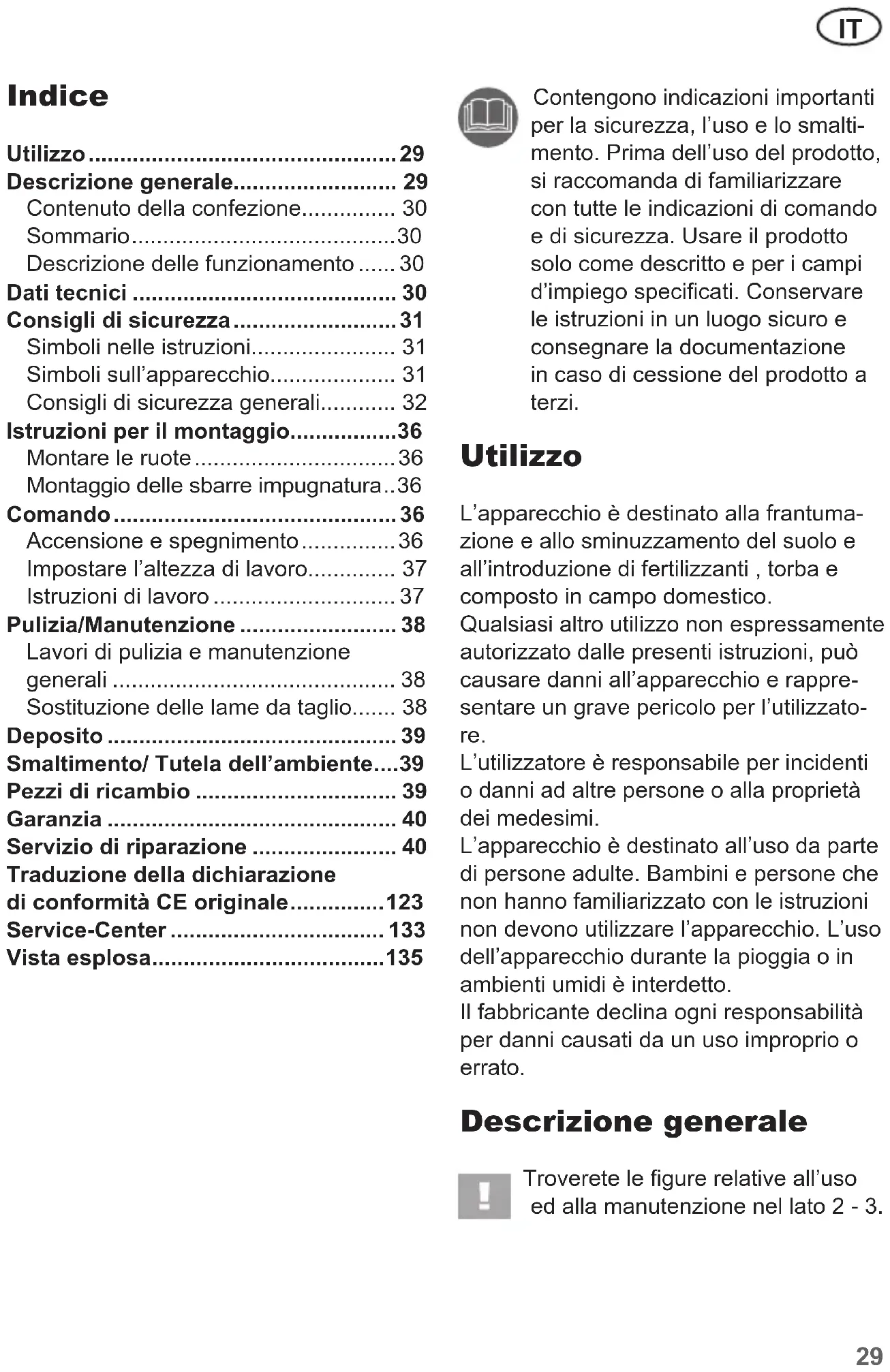 - Contengono indicazioni importanti per la sicurezza, l’uso e lo smalti- mento. Prima dell’uso del prodotto, si raccomanda di familiarizzare con tutte le indicazioni di comando e di sicurezza. Usare il prodotto solo come descritto e per i campi d’impiego specicati. Conservare le istruzioni in un luogo sicuro e consegnare la documentazione in caso di cessione del prodotto a terzi. Utilizzo L’apparecchio è destinato alla frantuma- zione e allo sminuzzamento del suolo e all’introduzione di fertilizzanti , torba e composto in campo domestico. Qualsiasi altro utilizzo non espressamente autorizzato dalle presenti istruzioni, può causare danni all’apparecchio e rappre- sentare un grave pericolo per l’utilizzato- re. L’utilizzatore è responsabile per incidenti o danni ad altre persone o alla proprietà dei medesimi. L’apparecchio è destinato all’uso da parte di persone adulte. Bambini e persone che non hanno familiarizzato con le istruzioni non devono utilizzare l’apparecchio. L’uso dell’apparecchio durante la pioggia o in ambienti umidi è interdetto. Il fabbricante declina ogni responsabilità per danni causati da un uso improprio o errato. Descrizione generale Troverete le gure relative all’uso ed alla manutenzione nel lato 2 - 3. Indice Utilizzo p. 29