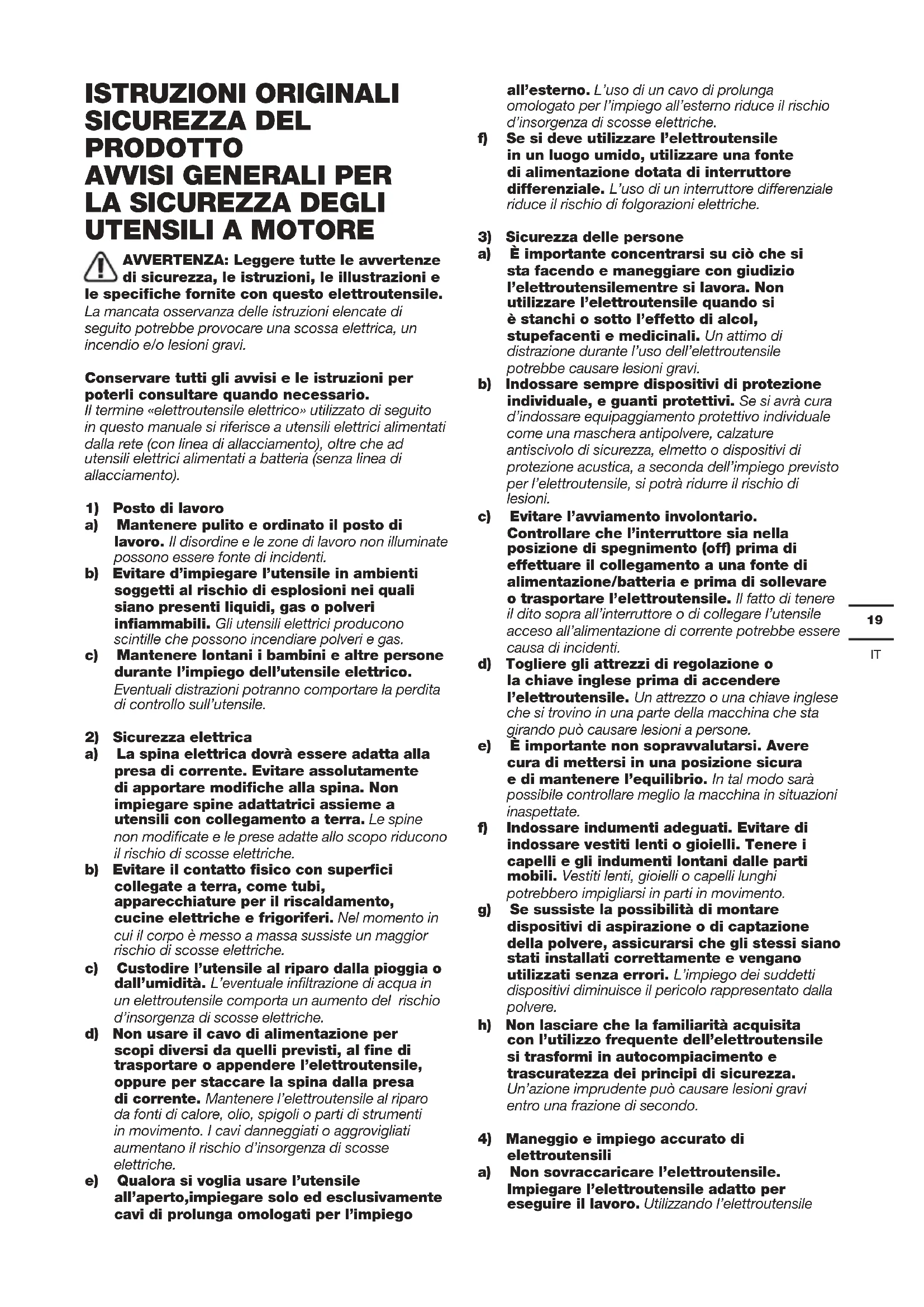 AVVERTENZA: Leggere tutte le avvertenze di sicurezza, le istruzioni, le illustrazioni e le specifiche fornite con questo elettroutensile. La mancata osservanza delle istruzioni elencate di seguito potrebbe provocare una scossa elettrica, un incendio e/o lesioni gravi. Conservare tutti gli avvisi e le istruzioni per poterli consultare quando necessario. Il termine «elettroutensile elettrico» utilizzato di seguito in questo manuale si riferisce a utensili elettrici alimentati dalla rete (con linea di allacciamento), oltre che ad utensili elettrici alimentati a batteria (senza linea di allacciamento).