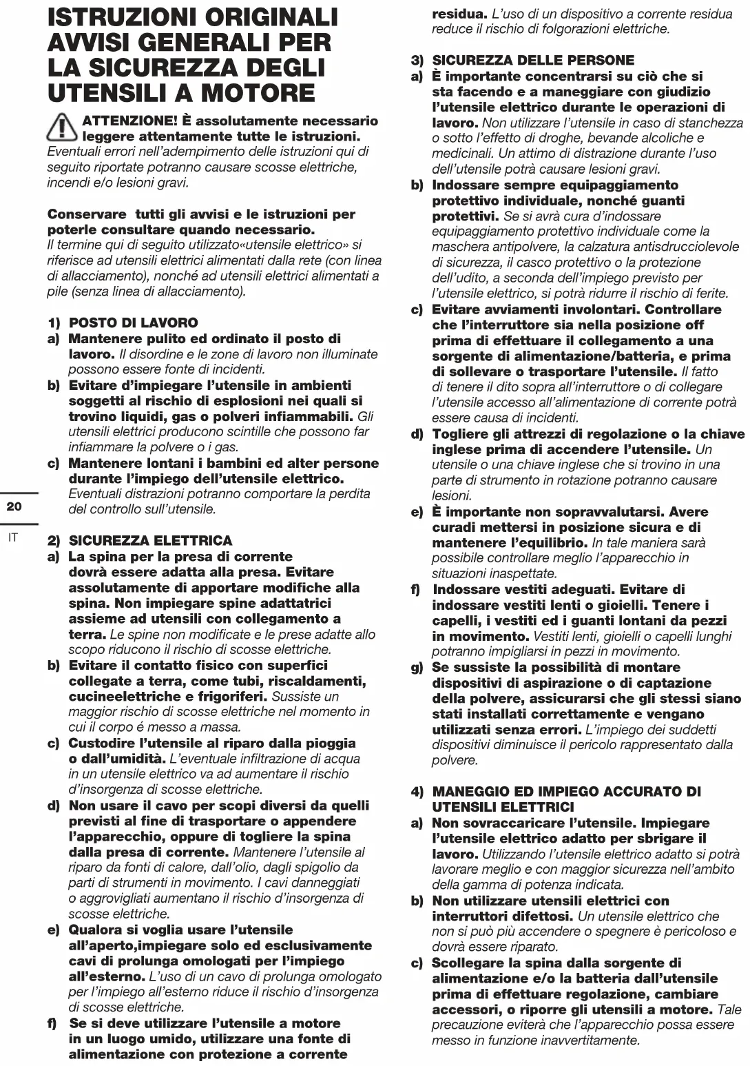 ATTENZIONE! È assolutamente necessario leggere attentamente tutte le istruzioni. Eventuali errori nell’adempimento delle istruzioni qui di seguito riportate potranno causare scosse elettriche, incendi e/o lesioni gravi. Conservare tutti gli avvisi e le istruzioni per poterle consultare quando necessario. Il termine qui di seguito utilizzato«utensile elettrico» si riferisce ad utensili elettrici alimentati dalla rete (con linea di allacciamento), nonché ad utensili elettrici alimentati a pile (senza linea di allacciamento).