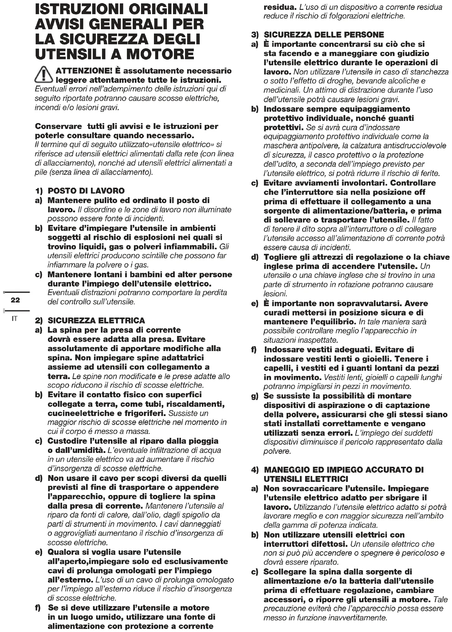 UTENSILI ELETTRICI a) Non sovraccaricare l’utensile. Impiegare l’utensile elettrico adatto per sbrigare il lavoro. Utilizzando l’utensile elettrico adatto si potrà lavorare meglio e con maggior sicurezza nell’ambito della gamma di potenza indicata. b) Non utilizzare utensili elettrici con interruttori difettosi. Un utensile elettrico che non si può più accendere o spegnere è pericoloso e dovrà essere riparato. c) Scollegare la spina dalla sorgente di alimentazione e/o la batteria dall’utensile prima di effettuare regolazione, cambiare accessori, o riporre gli utensili a motore. Tale precauzione eviterà che l’apparecchio possa essere messo in funzione inavvertitamente.23