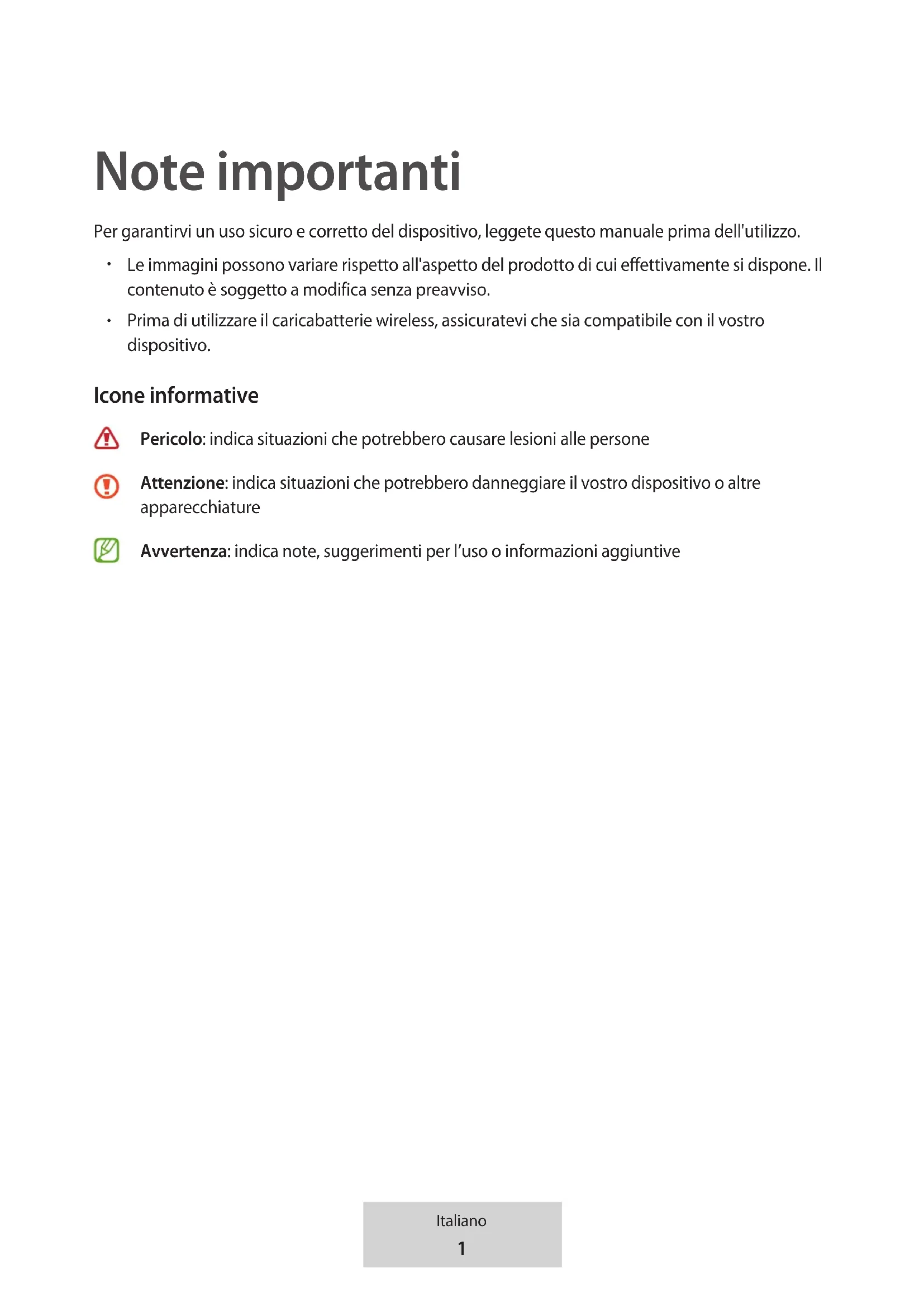 Prima di utilizzare il caricabatterie wireless, assicuratevi che sia compatibile con il vostro dispositivo. Icone informative Pericolo: indica situazioni che potrebbero causare lesioni alle persone Attenzione: indica situazioni che potrebbero danneggiare il vostro dispositivo o altre apparecchiature Avvertenza: indica note, suggerimenti per l’uso o informazioni aggiuntive2 Italiano Introduzione Contenuto della confezione Controllate che nella confezione siano presenti i seguenti elementi: