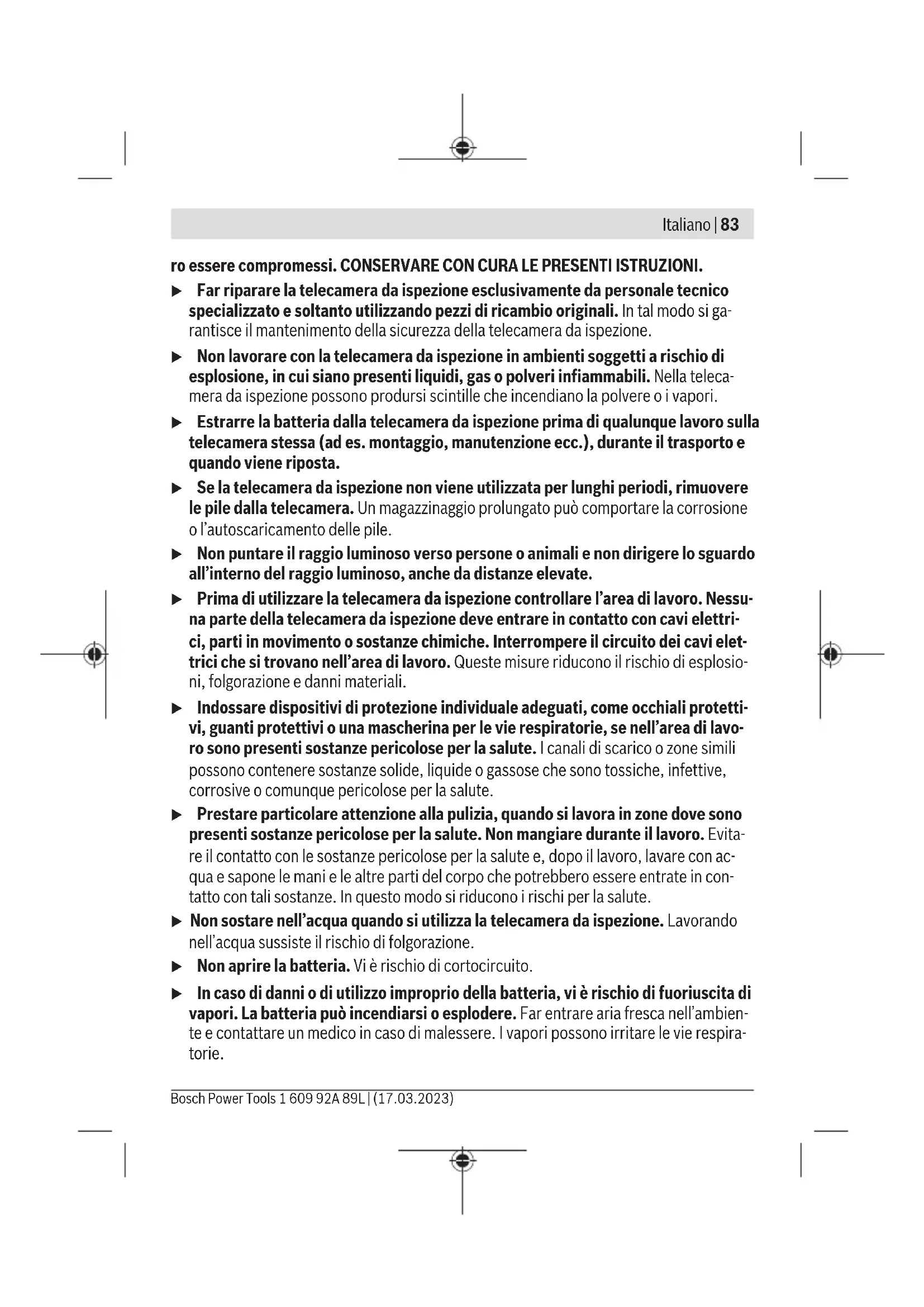 (aviso vermelho) Cartão Micro SD cheio Apague os ficheiros do cartão Micro SD (20). Remova o cartão Micro SD e insira-o de novo.Erro no cartão Micro SD Remova o cartão Micro SD (20) e insira-o de novo. Verifique o cartão Micro SD num outro aparelho. Manutenção e assistência técnica Manutenção e limpeza Não mergulhe o aparelho manual(13) em água ou em outros líquidos. Mantenha a câmara de inspeção sempre limpa. Limpe muito bem a câmara de inspeção e todos os meios auxiliares depois de ter trabalhado em áreas com substâncias prejudiciais à saúde. Limpar sujidades com um pano húmido e macio. Não utilize detergentes ou solventes. 1 609 92A 89L | (17.03.2023) Bosch Power ToolsPortuguês | 81 Limpe especialmente a lente da câmara(4) com regularidade e certifique-se de que não existem fiapos. Trocar a pilha botão integrada A troca da pilha botão tem de ser efetuada por um serviço de apoio ao cliente para ferramentas elétricas Bosch. u Atenção: substitua sempre uma pilha botão por uma pilha botão do mesmo tipo. Há risco de explosão. u Elimine as pilhas botão descarregadas de forma correta. As pilhas botão podem perder a estanqueidade e, consequentemente, danificar o produto ou ferir pessoas. Serviço pós-venda e aconselhamento O serviço pós-venda responde às suas perguntas a respeito de serviços de reparação e de manutenção do seu produto, assim como das peças sobressalentes. Desenhos explodidos e informações acerca das peças sobressalentes também em: www.bosch- pt.com A nossa equipa de consultores Bosch esclarece com prazer todas as suas dúvidas a respeito dos nossos produtos e acessórios. Indique para todas as questões e encomendas de peças sobressalentes a referência de 10 dígitos de acordo com a placa de caraterísticas do produto. Portugal Robert Bosch LDA Avenida Infante D. Henrique Lotes 2E – 3E 1800 Lisboa Para efetuar o seu pedido online de peças entre na página www.ferramentasbosch.com. Tel.: 21 8500000 Fax: 21 8511096 Encontra outros endereços da assistência técnica em: www.bosch-pt.com/serviceaddresses Transporte As baterias de iões de lítio recomendadas estão sujeitas ao direito de materiais perigosos. As baterias podem ser transportadas na rua pelo utilizador, sem mais obrigações. Na expedição por terceiros (porex: transporte aéreo ou expedição), devem ser observadas as especiais exigências quanto à embalagem e à designação. Neste caso é Bosch Power Tools 1 609 92A 89L | (17.03.2023)82 | Italiano necessário consultar um especialista de materiais perigosos ao preparar a peça a ser trabalhada. Só enviar baterias se a carcaça não estiver danificada. Colar contactos abertos e embalar a bateria de modo que não possa se movimentar dentro da embalagem. Por favor observe também eventuais diretivas nacionais suplementares. Eliminação A câmara de inspeção, pilhas/baterias, acessórios e embalagens devem ser reciclados de forma ambientalmente correta. Não deite a câmara de inspeção e as pilhas/baterias no lixo doméstico! Apenas para países da UE: Conforme a Diretiva Europeia 2012/19/UE e segundo a Diretiva Europeia 2006/66/CE é necessário recolher separadamente as câmaras de inspeção que já não são mais usadas e as baterias/pilhas defeituosas ou gastas e encaminhá-las para uma reciclagem ecológica. No caso de uma eliminação incorreta, os aparelhos elétricos e eletrónicos antigos podem ter efeitos nocivos no ambiente e na saúda humada devido à possível presença de substâncias perigosas. Baterias/pilhas: Lítio: Observar as indicações no capítulo Transporte (ver "Transporte", Página81). A pilha botão integrada só pode ser retirada por pessoal técnico para ser eliminada. Italiano Avvertenze di sicurezza Leggere e osservare tutte le avvertenze e le istruzioni. Se la telecamera da ispezione non viene utilizzata conformemente alle presenti istruzioni, i dispositivi di protezione integrati nella telecamera da ispezione potrebbe- 1 609 92A 89L | (17.03.2023) Bosch Power ToolsItaliano | 83 ro essere compromessi. CONSERVARE CON CURA LE PRESENTI ISTRUZIONI. u Far riparare la telecamera da ispezione esclusivamente da personale tecnico specializzato e soltanto utilizzando pezzi di ricambio originali. In tal modo si ga- rantisce il mantenimento della sicurezza della telecamera da ispezione. u Non lavorare con la telecamera da ispezione in ambienti soggetti a rischio di esplosione, in cui siano presenti liquidi, gas o polveri infiammabili. Nella teleca- mera da ispezione possono prodursi scintille che incendiano la polvere o i vapori. u Estrarre la batteria dalla telecamera da ispezione prima di qualunque lavoro sulla telecamera stessa (ad es. montaggio, manutenzione ecc.), durante il trasporto e quando viene riposta. u Se la telecamera da ispezione non viene utilizzata per lunghi periodi, rimuovere le pile dalla telecamera. Un magazzinaggio prolungato può comportare la corrosione o l’autoscaricamento delle pile. u Non puntare il raggio luminoso verso persone o animali e non dirigere lo sguardo all’interno del raggio luminoso, anche da distanze elevate. u Prima di utilizzare la telecamera da ispezione controllare l’area di lavoro. Nessu- na parte della telecamera da ispezione deve entrare in contatto con cavi elettri- ci, parti in movimento o sostanze chimiche. Interrompere il circuito dei cavi elet- trici che si trovano nell’area di lavoro. Queste misure riducono il rischio di esplosio- ni, folgorazione e danni materiali. u Indossare dispositivi di protezione individuale adeguati, come occhiali protetti- vi, guanti protettivi o una mascherina per le vie respiratorie, se nell’area di lavo- ro sono presenti sostanze pericolose per la salute. I canali di scarico o zone simili possono contenere sostanze solide, liquide o gassose che sono tossiche, infettive, corrosive o comunque pericolose per la salute. u Prestare particolare attenzione alla pulizia, quando si lavora in zo