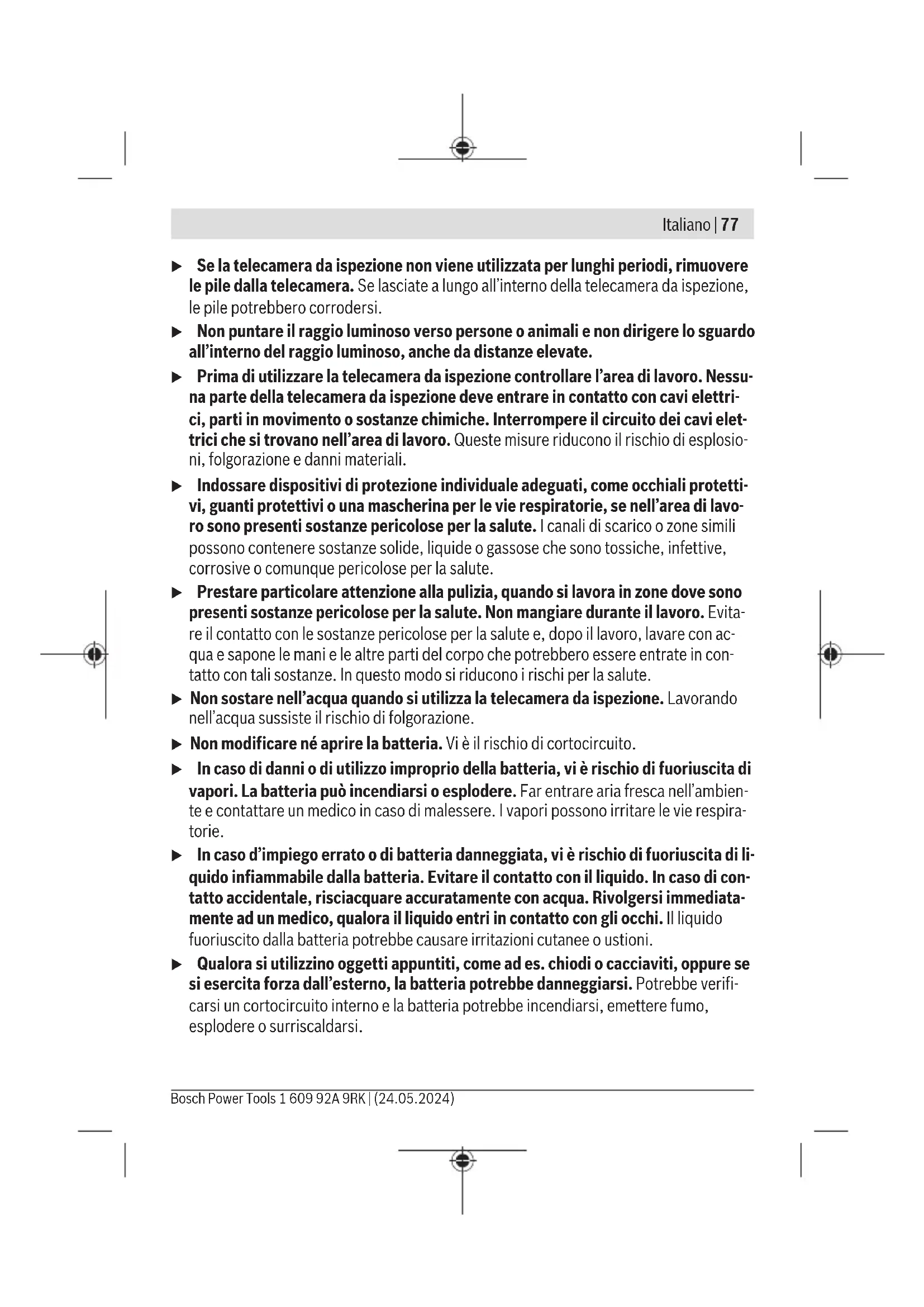 Con display telecamera, con funzioneUp Indication, luminosità media del display, lampada del- la telecamera con luminosità del 50% F) Con GBA12V2.0Ah G) Peso senza batterie/pile/adattatore pile/cavo della telecamera Montaggio Alimentazione La telecamera da ispezione può essere fatta funzionare con una batteria al litioBosch, con pile a stilo comunemente reperibili in commercio o con pile a stilo NiMH comune- mente reperibili in commercio. L’indicatore del livello di carica(c) nel display mostra il livello di carica di batterie al litio, pile a stilo o pile a stilo NiMH. Funzionamento con adattatore pile (vederefig.A) Le pile a stilo o le batterie NiMH vengono inserite nell’apposito adattatore. u L’adattatore pile è destinato al solo impiego nelle telecamere da ispezione Bosch previste e non deve essere utilizzato con elettroutensili. Per inserire le pile a stilo o le batterie, spingere il rivestimento(20) dell’adattatore nel vano(19). Inserire le pile a stilo, o le batterie, nel rivestimento conformemente all’imma- gine sulla calotta di chiusura(22). Spingere la calotta di chiusura sull’involucro fino a far- la scattare udibilmente in sede, in modo che sia a filo con l’impugnatura della telecamera da ispezione. Per prelevare le pile a stilo, o le batterie, premere i tasti di sbloccaggio(21) della calotta di chiusura(22) ed estrarre la calotta stessa. Estrarre l’involucro interno(20) dal vano(19). Sostituire sempre contemporaneamente tutte le pile, o tutte le batterie. Utilizzare esclu- sivamente pile o batterie dello stesso produttore e della stessa capacità. 1 609 92A 9RK | (24.05.2024) Bosch Power ToolsItaliano | 83 u Se la telecamera da ispezione non viene utilizzata per lunghi periodi, rimuovere le pile a stilo o le batterie dalla telecamera. Se lasciate a lungo all’interno della tele- camera da ispezione, le pile o le batterie potrebbero corrodersi. Funzionamento con batteria (vederefig.B) u Utilizzare esclusivamente i caricabatteria indicati nei dati tecnici. Soltanto questi caricabatteria sono adatti alle batterie al litio utilizzabili nella telecamera da ispezione. Avvertenza: a causa delle norme internazionali per il trasporto, le batterie al litio vengo- no fornite parzialmente cariche. Per assicurare la piena potenza della batteria, ricaricarla completamente prima dell’impiego iniziale. Per inserire la batteria(14) carica, spingerla nel vano(19) fino a farla scattare udibil- mente in sede, in modo che sia a filo con l’impugnatura della telecamera da ispezione. Per rimuovere la batteria(14), premere i tasti di sbloccaggio(21) ed estrarre la batteria dal vano(19). Durante tale operazione, non esercitare forza. Avvertenze per l’impiego ottimale della batteria Proteggere la batteria ricaricabile da umidità ed acqua. Conservare la batteria esclusivamente nel campo di temperatura fra −20 °C e 50°C. Non lasciare la batteria all’interno dell’auto, ad es. nel periodo estivo. Una sensibile riduzione della durata del funzionamento dopo l’operazione di ricarica sta ad indicare che la batteria ricaricabile dovrà essere sostituita. Attenersi alle indicazioni relative allo smaltimento. Montaggio del cavo della telecamera (vederefig.C) Per utilizzare la telecamera da ispezione, il cavo della telecamera(1) deve essere inseri- to nel dispositivo palmare(13). Inserire in posizione corretta il connettore del cavo della telecamera(1) nella presa della telecamera(23), facendolo scattare in posizione. Smontaggio del cavo della telecamera (vederefig.D) Per rimuovere il cavo della telecamera(1) esercitare pressione sul bloccaggio(24) ed estrarre il connettore dal dispositivo palmare(13). Montaggio specchietto, magnete o gancio (vederefig.E) Lo specchietto(27), il gancio(26) o il magnete(25) possono essere applicati sulla testa della telecamera(2) come dispositivi ausiliari. Inserire fino a battuta uno dei 3dispositivi ausiliari sulla testa della telecamera(2), come illustrato in figura. Bosch Power Tools 1 609 92A 9RK | (24.05.2024)84 | Italiano Avvertenza: il magnete(25) e il gancio(26) sono adatti esclusivamente per spostare e rimuovere oggetti piccoli, leggeri e facilmente spostabili. In caso di trazione eccessiva, la telecamera da ispezione o i dispositivi ausiliari possono danneggiarsi. Utilizzo u Proteggere il dispositivo palmare e la batteria o l’apposito adattatore dall’irra- diazione solare diretta. Proteggere la batteria ovvero l’apposito adattatore dall’umidità. Cavo della telecamera(1) e testa della telecamera(2) sono impermea- bili se montati correttamente, mentre il dispositivo palmare(13) è protetto contro gli spruzzi d’acqua. La batteria(14) e l’apposito adattatore non sono tuttavia protetti dall’acqua. In caso di contatto con l’acqua, sussiste il rischio di scossa elettrica o dan- ni. u Non utilizzare la telecamera da ispezione se la lente della testa della telecamera(2) è appannata. Accendere la telecamera da ispezione solo quando l’umidità è evaporata. In caso contrario, la telecamera da ispezione può danneggiar- si. u La lampada(3) accesa può scaldarsi molto durante l’utilizzo. Non toccare la lam- pada, per evitare ustioni. u Non esporre la telecamera da ispezione a temperature od oscillazioni termiche estreme. Ad esempio, evitare di lasciarla per lungo tempo all’interno dell’auto. In caso di forti oscillazioni di temperatura, lasciare che la telecamera da ispezione raggiunga la normale temperatura prima di metterla in funzione. Messa in funzione Accensione/spegnimento Per accendere la telecamera da ispezione, premere il tasto di accensione/ spegnimento(6) o il tasto centrale(9). Avvertenza: se all’accensione il cavo della telecamera non è montato, sul display viene visualizzato un messaggio d’errore. Per spegnere la telecamera da ispezione, premere il tasto di accensione/ spegnimento(6) fino a quando il display non si spegne. Se per un certo periodo di tempo non viene premuto alcun tasto sulla telecamera 