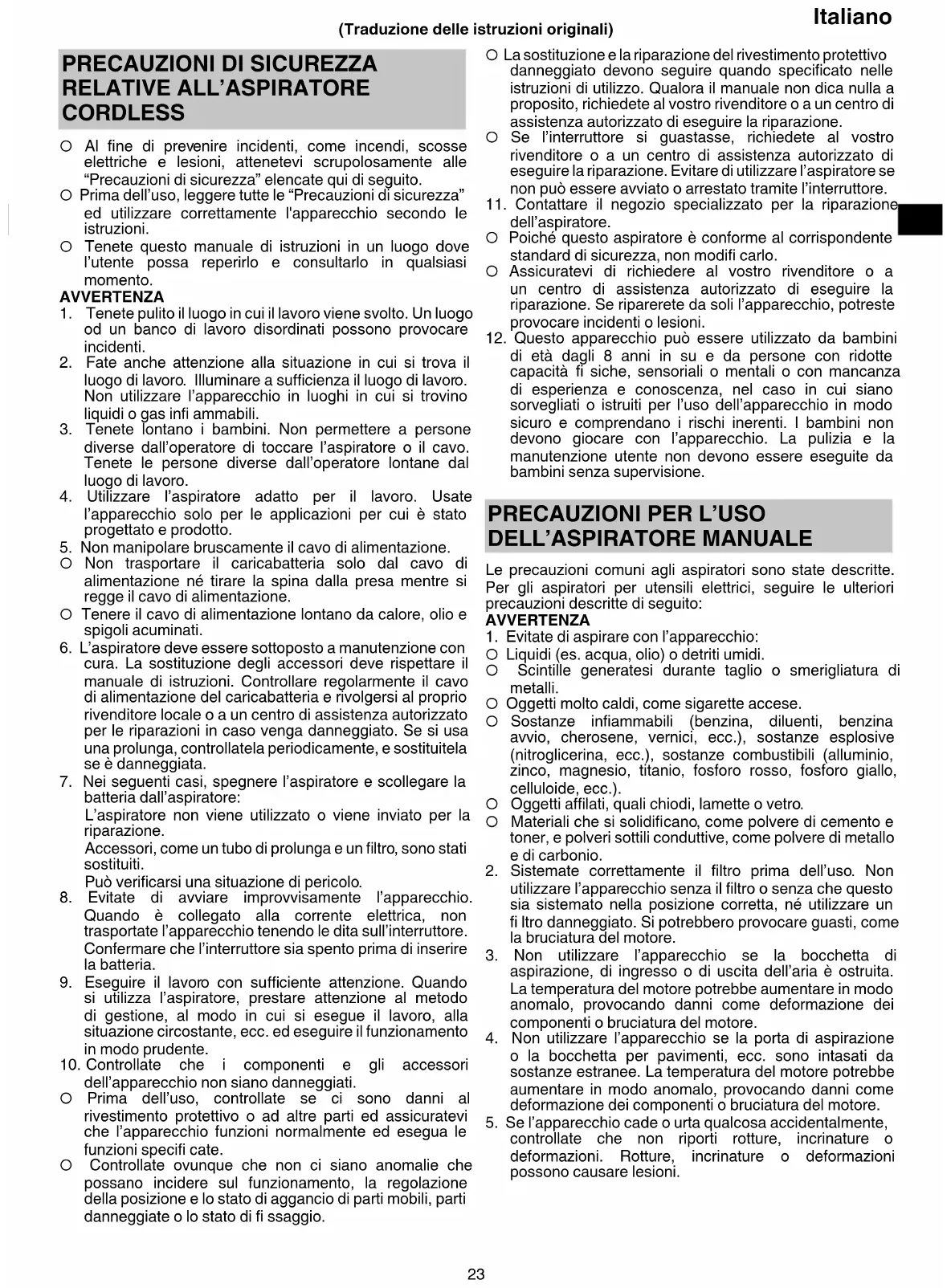 CORDLESS ○ Al fi ne di prevenire incidenti, come incendi, scosse elettriche e lesioni, attenetevi scrupolosamente alle “Precauzioni di sicurezza” elencate qui di seguito. ○ Prima dell’uso, leggere tutte le “Precauzioni di sicurezza” ed utilizzare correttamente l'apparecchio secondo le istruzioni. ○ Tenete questo manuale di istruzioni in un luogo dove l’utente possa reperirlo e consultarlo in qualsiasi momento. AVVERTENZA