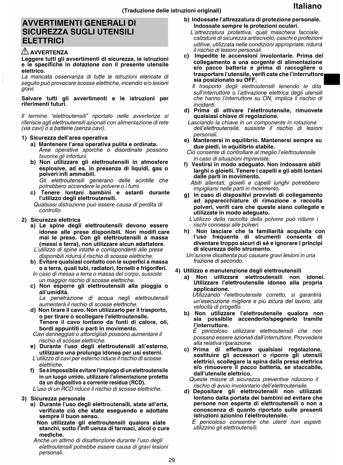 ELETTRICI AVVERTENZA Leggere tutti gli avvertimenti di sicurezza, le istruzioni e le specifi che in dotazione con il presente utensile elettrico. La mancata osservanza di tutte le istruzioni elencate di seguito può provocare scosse elettriche, incendio e/o lesioni gravi. Salvare tutti gli avvertimenti e le istruzioni per riferimenti futuri. Il termine “elettroutensili” riportato nelle avvertenze si riferisce agli elettroutensili azionati con alimentazione di rete (via cavi) o a batterie (senza cavi).