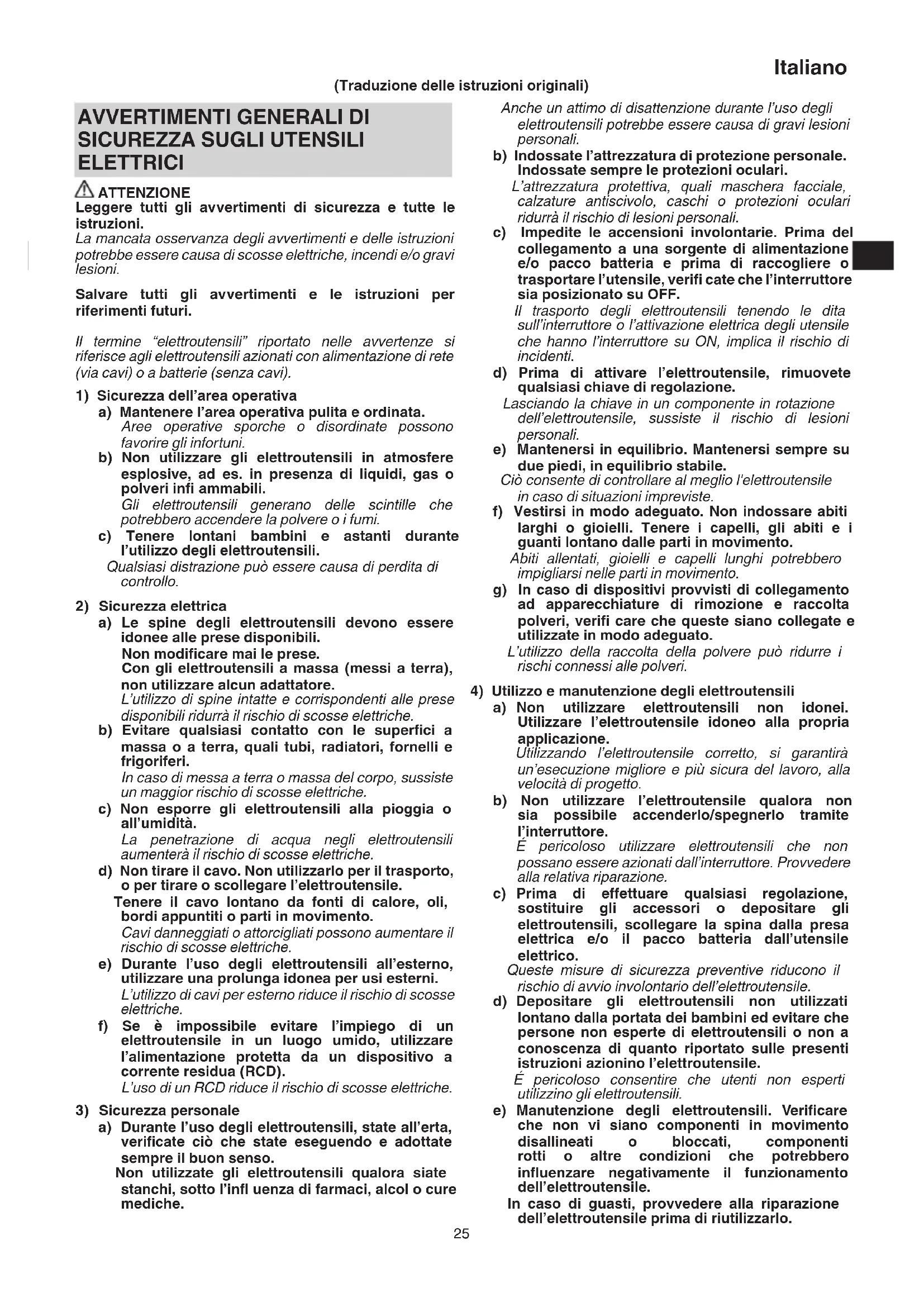 ELETTRICI ATTENZIONE Leggere tutti gli avvertimenti di sicurezza e tutte le istruzioni. La mancata osservanza degli avvertimenti e delle istruzioni potrebbe essere causa di scosse elettriche, incendi e/o gravi lesioni. Salvare tutti gli avvertimenti e le istruzioni per riferimenti futuri. Il termine “elettroutensili” riportato nelle avvertenze si riferisce agli elettroutensili azionati con alimentazione di rete (via cavi) o a batterie (senza cavi).