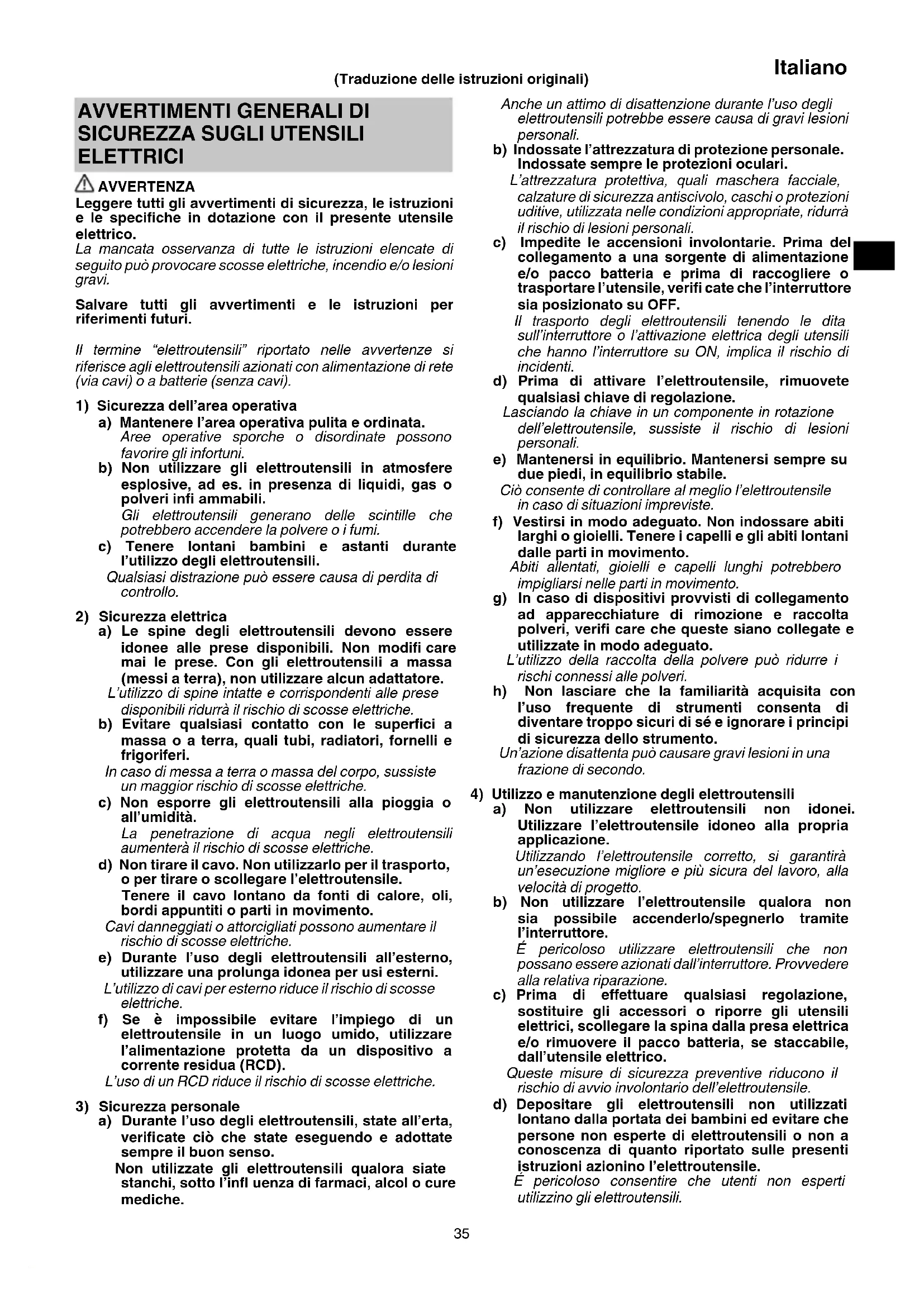 ELETTRICI AVVERTENZA Leggere tutti gli avvertimenti di sicurezza, le istruzioni e le specifi che in dotazione con il presente utensile elettrico. La mancata osservanza di tutte le istruzioni elencate di seguito può provocare scosse elettriche, incendio e/o lesioni gravi. Salvare tutti gli avvertimenti e le istruzioni per riferimenti futuri. Il termine “elettroutensili” riportato nelle avvertenze si riferisce agli elettroutensili azionati con alimentazione di rete (via cavi) o a batterie (senza cavi).