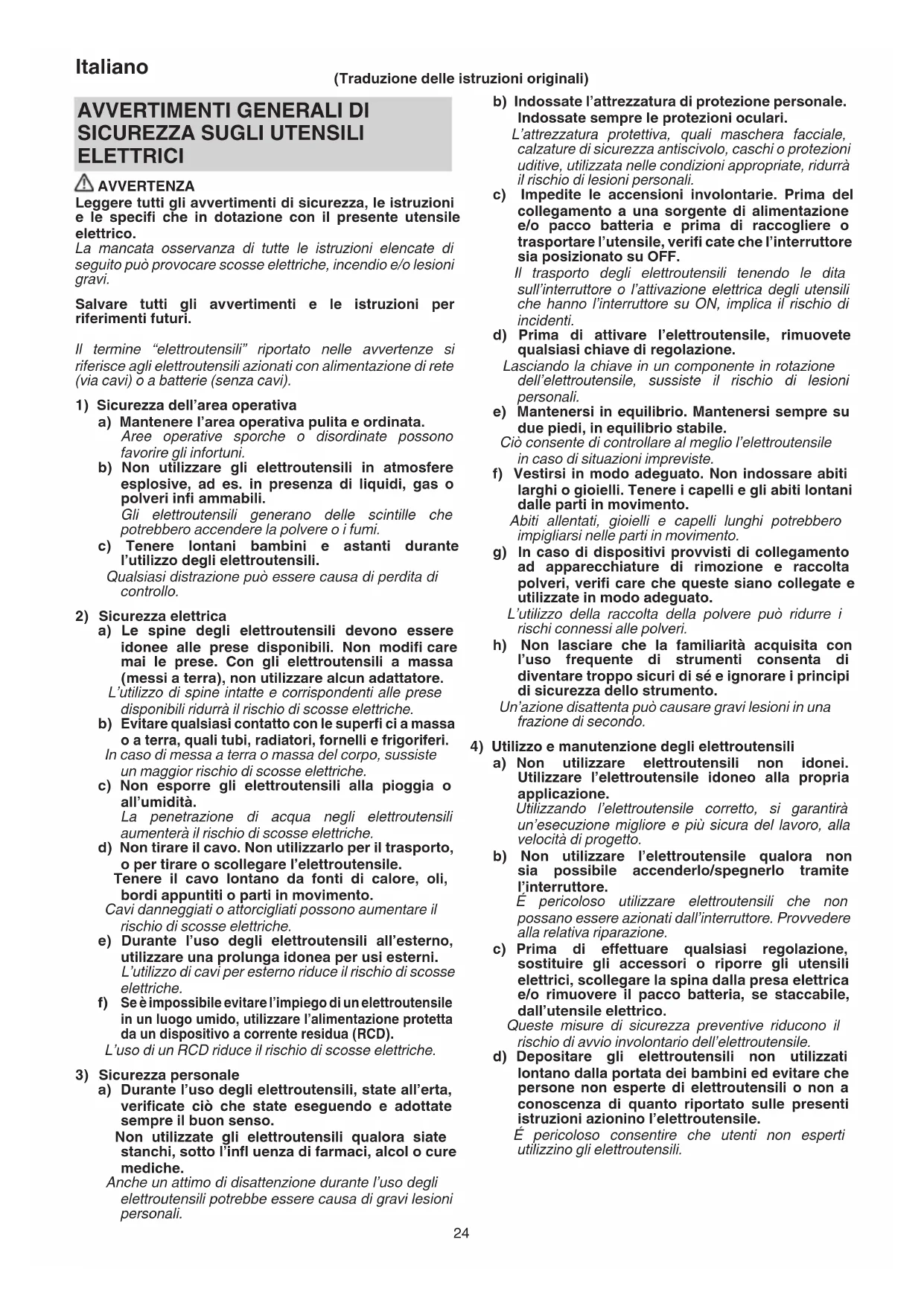 ELETTRICI AVVERTENZA Leggere tutti gli avvertimenti di sicurezza, le istruzioni e le specifi che in dotazione con il presente utensile elettrico. La mancata osservanza di tutte le istruzioni elencate di seguito può provocare scosse elettriche, incendio e/o lesioni gravi. Salvare tutti gli avvertimenti e le istruzioni per riferimenti futuri. Il termine “elettroutensili” riportato nelle avvertenze si riferisce agli elettroutensili azionati con alimentazione di rete (via cavi) o a batterie (senza cavi).