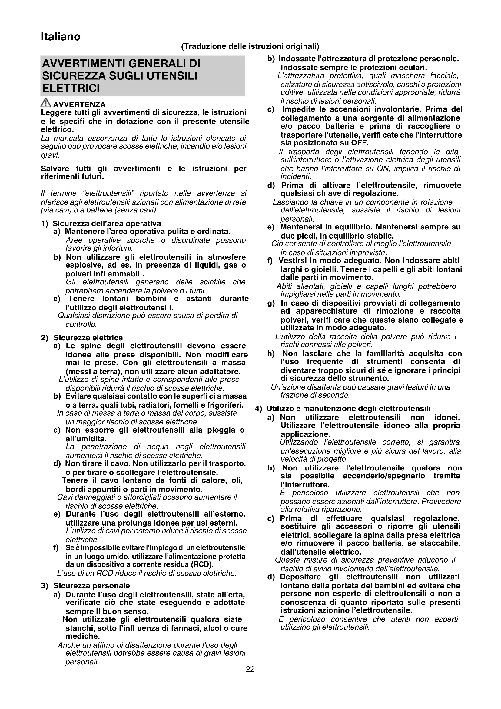 ELETTRICI AVVERTENZA Leggere tutti gli avvertimenti di sicurezza, le istruzioni e le specifi che in dotazione con il presente utensile elettrico. La mancata osservanza di tutte le istruzioni elencate di seguito può provocare scosse elettriche, incendio e/o lesioni gravi. Salvare tutti gli avvertimenti e le istruzioni per riferimenti futuri. Il termine “elettroutensili” riportato nelle avvertenze si riferisce agli elettroutensili azionati con alimentazione di rete (via cavi) o a batterie (senza cavi).