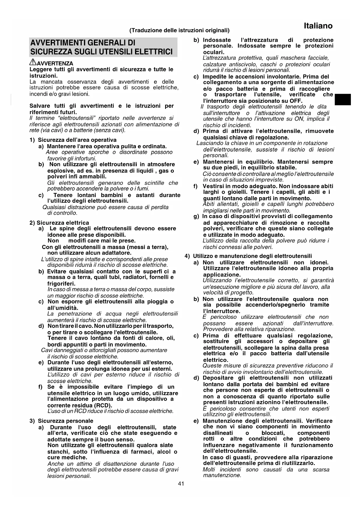 AVVERTENZA Leggere tutti gli avvertimenti di sicurezza e tutte le istruzioni. La mancata osservanza degli avvertimenti e delle istruzioni potrebbe essere causa di scosse elettriche, incendi e/o gravi lesioni. Salvare tutti gli avvertimenti e le istruzioni per riferimenti futuri. Il termine “elettroutensili” riportato nelle avvertenze si riferisce agli elettroutensili azionati con alimentazione di rete (via cavi) o a batterie (senza cavi).