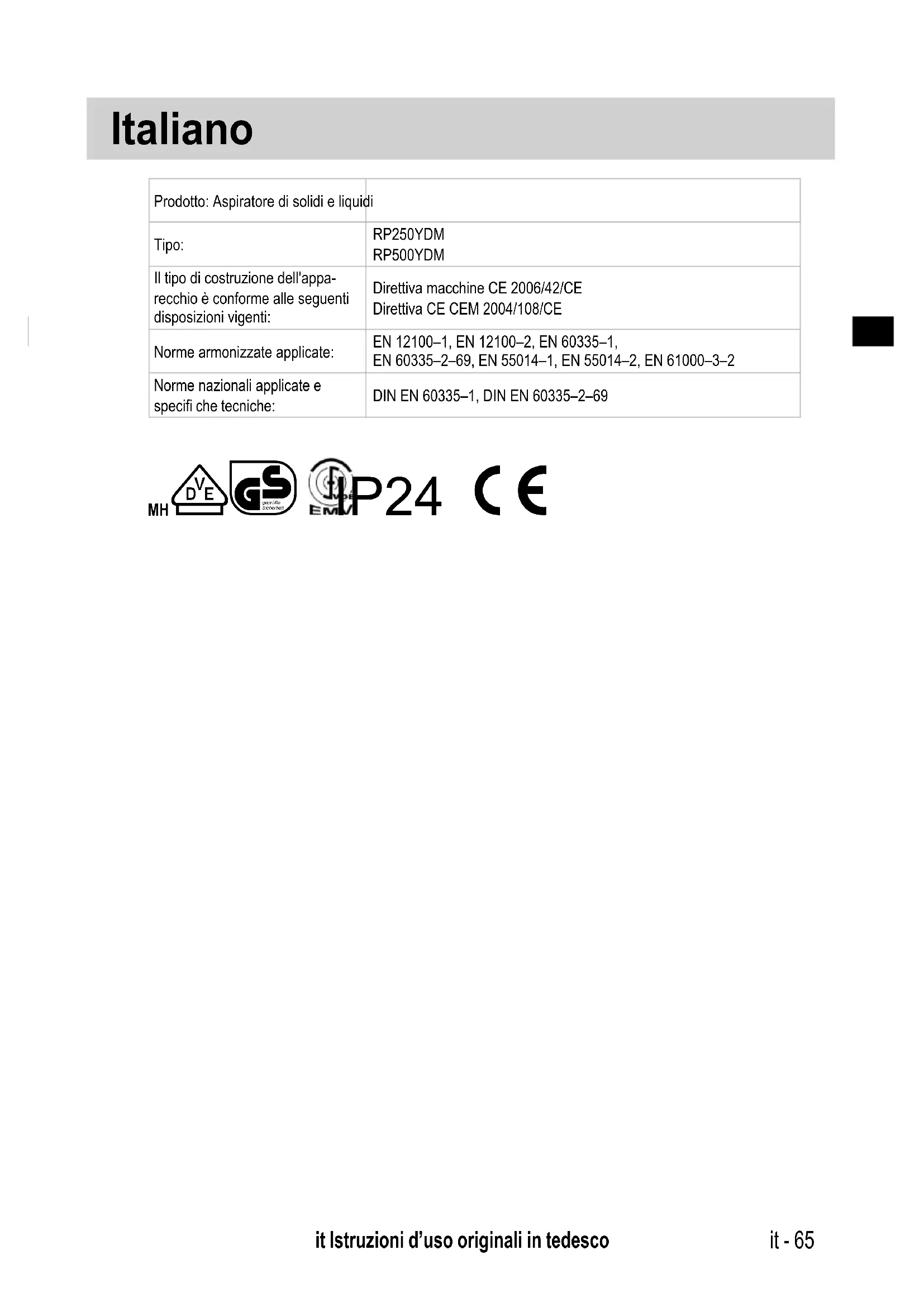 Prodotto: Aspiratore di solidi e liquidiTipo:RP250YDMRP500YDMIl tipo di costruzione dell'appa-recchio è conforme alle seguenti disposizioni vigenti:Direttiva macchine CE 2006/42/CEDirettiva CE CEM 2004/108/CENorme armonizzate applicate:EN 12100–1, EN 12100–2, EN 60335–1, EN 60335–2–69, EN 55014–1, EN 55014–2, EN 61000–3–2Norme nazionali applicate e specifi che tecniche:DIN EN 60335–1, DIN EN 60335–2–69
