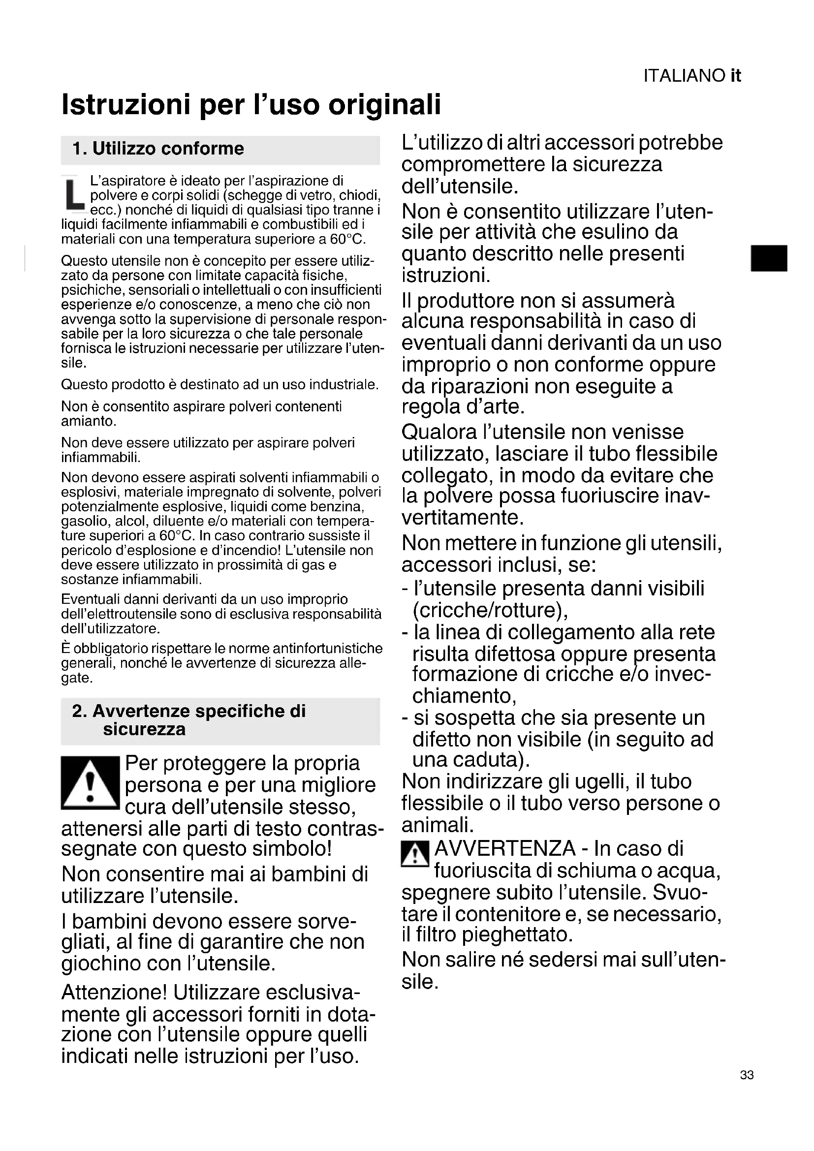 Istruzioni per l’uso originali L’aspiratore è ideato per l’aspirazione di polvere e corpi solidi (schegge di vetro, chiodi, ecc.) nonché di liquidi di qualsiasi tipo tranne i liquidi facilmente infiammabili e combustibili ed i materiali con una temperatura superiore a 60°C. Questo utensile non è concepito per essere utiliz- zato da persone con limitate capacità fisiche, psichiche, sensoriali o intellettuali o con insufficienti esperienze e/o conoscenze, a meno che ciò non avvenga sotto la supervisione di personale respon- sabile per la loro sicurezza o che tale personale fornisca le istruzioni necessarie per utilizzare l’uten- sile. Questo prodotto è destinato ad un uso industriale. Non è consentito aspirare polveri contenenti amianto. Non deve essere utilizzato per aspirare polveri infiammabili. Non devono essere aspirati solventi infiammabili o esplosivi, materiale impregnato di solvente, polveri potenzialmente esplosive, liquidi come benzina, gasolio, alcol, diluente e/o materiali con tempera- ture superiori a 60°C. In caso contrario sussiste il pericolo d’esplosione e d’incendio! L’utensile non deve essere utilizzato in prossimità di gas e sostanze infiammabili. Eventuali danni derivanti da un uso improprio dell’elettroutensile sono di esclusiva responsabilità dell’utilizzatore. È obbligatorio rispettare le norme antinfortunistiche generali, nonché le avvertenze di sicurezza alle- gate. Per proteggere la propria persona e per una migliore cura dell’utensile stesso, attenersi alle parti di testo contras- segnate con questo simbolo! Non consentire mai ai bambini di utilizzare l’utensile. I bambini devono essere sorve- gliati, al fine di garantire che non giochino con l’utensile. Attenzione! Utilizzare esclusiva- mente gli accessori forniti in dota- zione con l’utensile oppure quelli indicati nelle istruzioni per l’uso. L’utilizzo di altri accessori potrebbe compromettere la sicurezza dell’utensile. Non è consentito utilizzare l’uten- sile per attività che esulino da quanto descritto nelle presenti istruzioni. Il produttore non si assumerà alcuna responsabilità in caso di eventuali danni derivanti da un uso improprio o non conforme oppure da riparazioni non eseguite a regola d’arte. Qualora l’utensile non venisse utilizzato, lasciare il tubo flessibile collegato, in modo da evitare che la polvere possa fuoriuscire inav- vertitamente. Non mettere in funzione gli utensili, accessori inclusi, se: - l’utensile presenta danni visibili (cricche/rotture), - la linea di collegamento alla rete risulta difettosa oppure presenta formazione di cricche e/o invec- chiamento, - si sospetta che sia presente un difetto non visibile (in seguito ad una caduta). Non indirizzare gli ugelli, il tubo flessibile o il tubo verso persone o animali. AVVERTENZA - In caso di fuoriuscita di schiuma o acqua, spegnere subito l’utensile. Svuo- tare il contenitore e, se necessario, il filtro pieghettato. Non salire né sedersi mai sull’uten- sile.