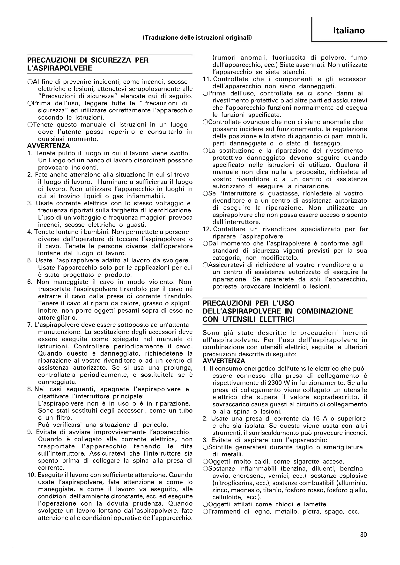 Sono già state descritte le precauzioni inerenti all’aspirapolvere. Per l’uso dell’aspirapolvere in combinazione con utensili elettrici, seguite le ulteriori precauzioni descritte di seguito: AVVERTENZA