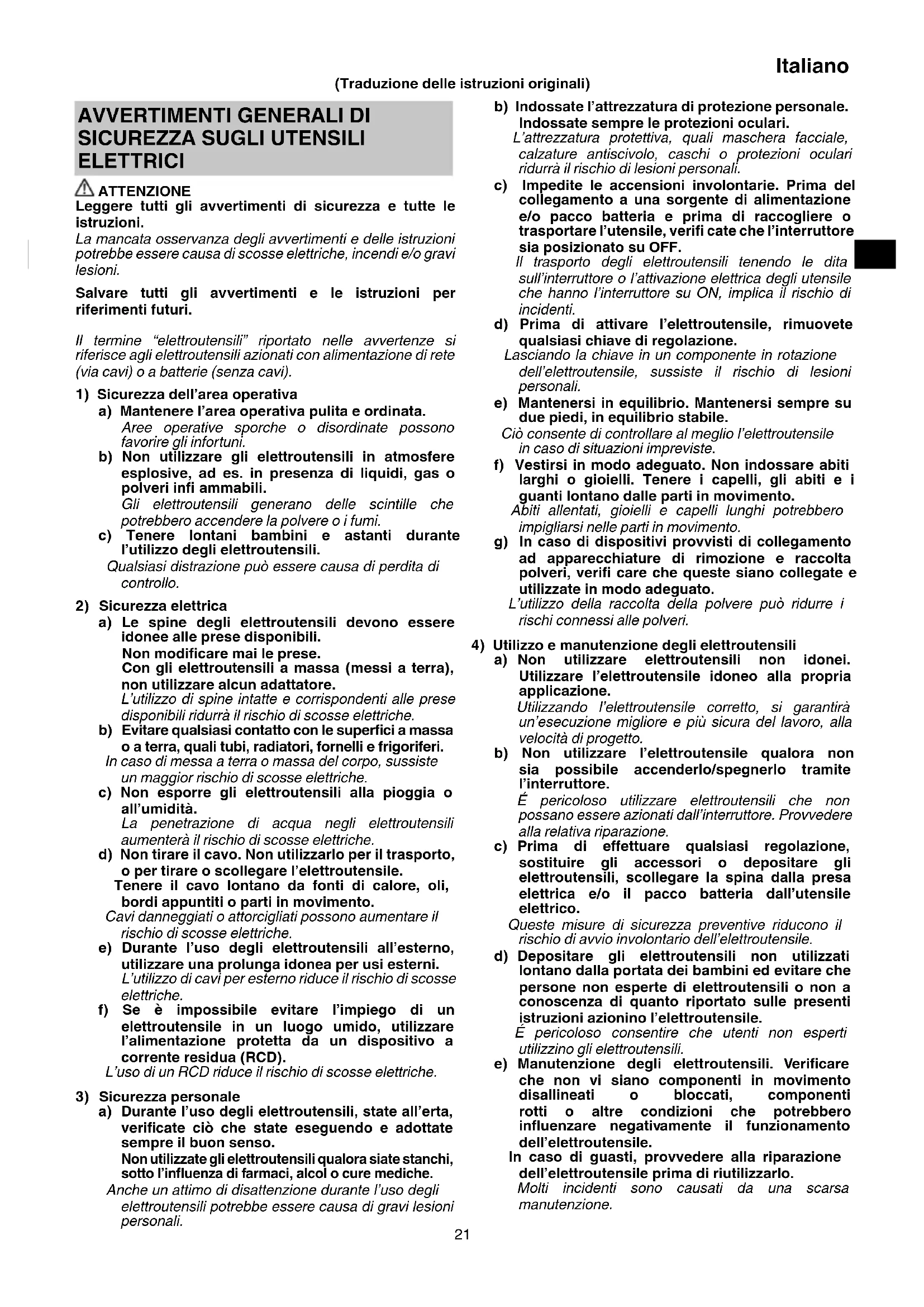 ELETTRICI ATTENZIONE Leggere tutti gli avvertimenti di sicurezza e tutte le istruzioni. La mancata osservanza degli avvertimenti e delle istruzioni potrebbe essere causa di scosse elettriche, incendi e/o gravi lesioni. Salvare tutti gli avvertimenti e le istruzioni per riferimenti futuri. Il termine “elettroutensili” riportato nelle avvertenze si riferisce agli elettroutensili azionati con alimentazione di rete (via cavi) o a batterie (senza cavi).
