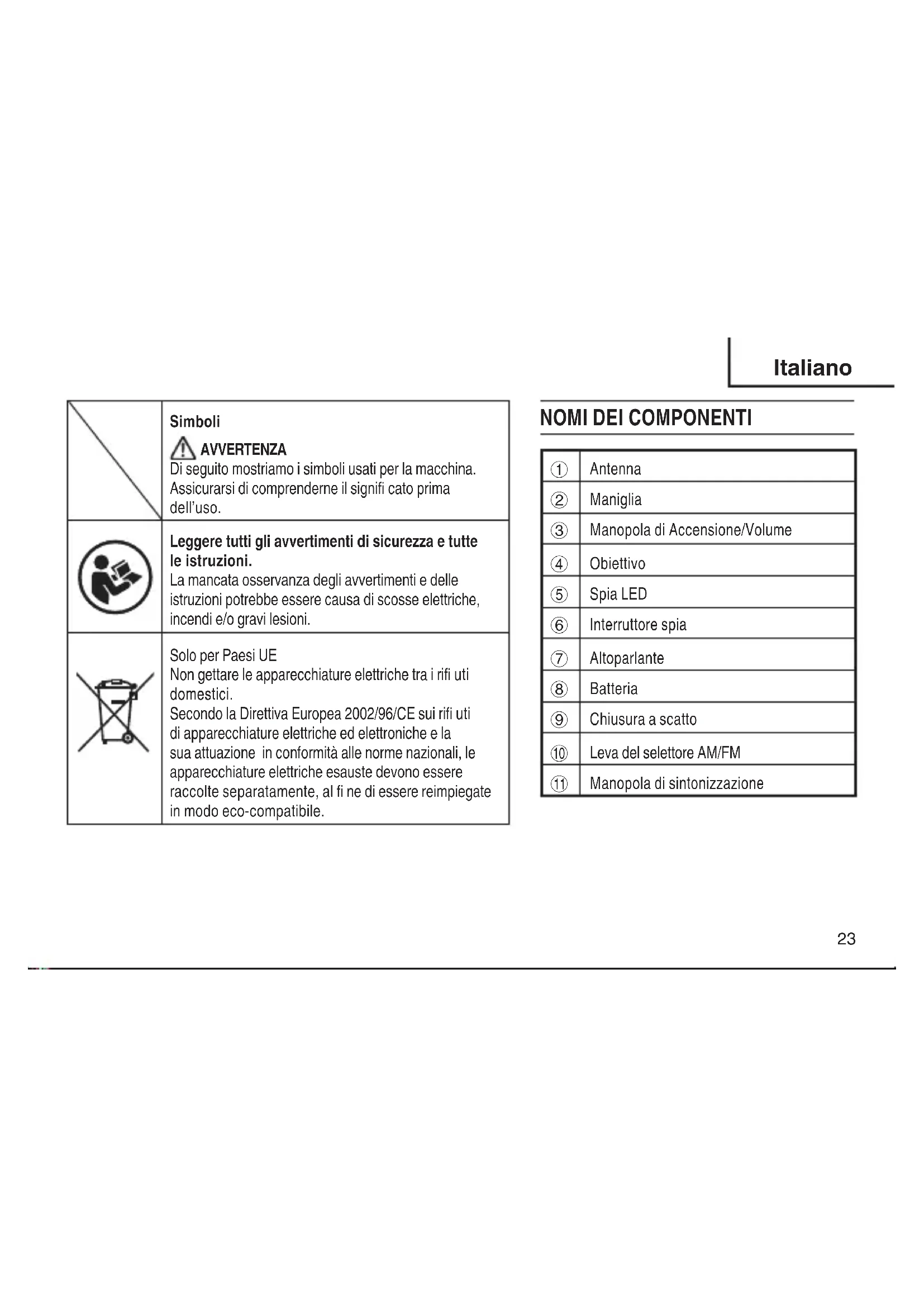AVVERTENZA Di seguito mostriamo i simboli usati per la macchina. Assicurarsi di comprenderne il signifi cato prima dell’uso. Leggere tutti gli avvertimenti di sicurezza e tutte le istruzioni. La mancata osservanza degli avvertimenti e delle istruzioni potrebbe essere causa di scosse elettriche, incendi e/o gravi lesioni. Solo per Paesi UE Non gettare le apparecchiature elettriche tra i rifi uti domestici. Secondo la Direttiva Europea 2002/96/CE sui rifi uti di apparecchiature elettriche ed elettroniche e la sua attuazione in conformità alle norme nazionali, le apparecchiature elettriche esauste devono essere raccolte separatamente, al fi ne di essere reimpiegate in modo eco-compatibile.