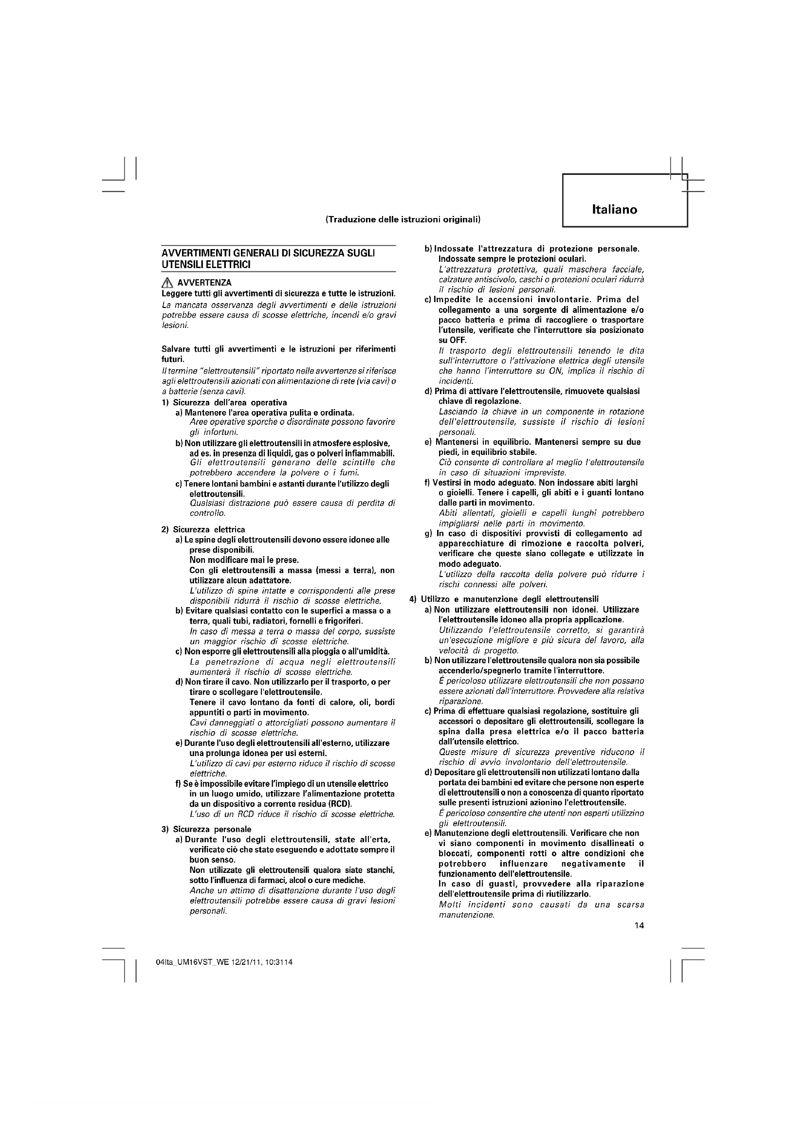 a) Non utilizzare elettroutensili non idonei. Utilizzare l'elettroutensile idoneo alla propria applicazione. Utilizzando l'elettroutensile corretto, si garantirà un'esecuzione migliore e più sicura del lavoro, alla velocità di progetto. b) Non utilizzare l'elettroutensile qualora non sia possibile accenderlo/spegnerlo tramite l'interruttore. É pericoloso utilizzare elettroutensili che non possano essere azionati dall'interruttore. Provvedere alla relativa riparazione. c) Prima di effettuare qualsiasi regolazione, sostituire gli accessori o depositare gli elettroutensili, scollegare la spina dalla presa elettrica e/o il pacco batteria dall’utensile elettrico. Queste misure di sicurezza preventive riducono il rischio di avvio involontario dell'elettroutensile. d) Depositare gli elettroutensili non utilizzati lontano dalla portata dei bambini ed evitare che persone non esperte di elettroutensili o non a conoscenza di quanto riportato sulle presenti istruzioni azionino l'elettroutensile. É pericoloso consentire che utenti non esperti utilizzino gli elettroutensili. e) Manutenzione degli elettroutensili. Verificare che non vi siano componenti in movimento disallineati o bloccati, componenti rotti o altre condizioni che potrebbero influenzare negativamente il funzionamento dell'elettroutensile. In caso di guasti, provvedere alla riparazione dell'elettroutensile prima di riutilizzarlo. Molti incidenti sono causati da una scarsa manutenzione. (Traduzione delle istruzioni originali) 04Ita_UM16VST_WE 12/21/11, 10:3114Italiano
