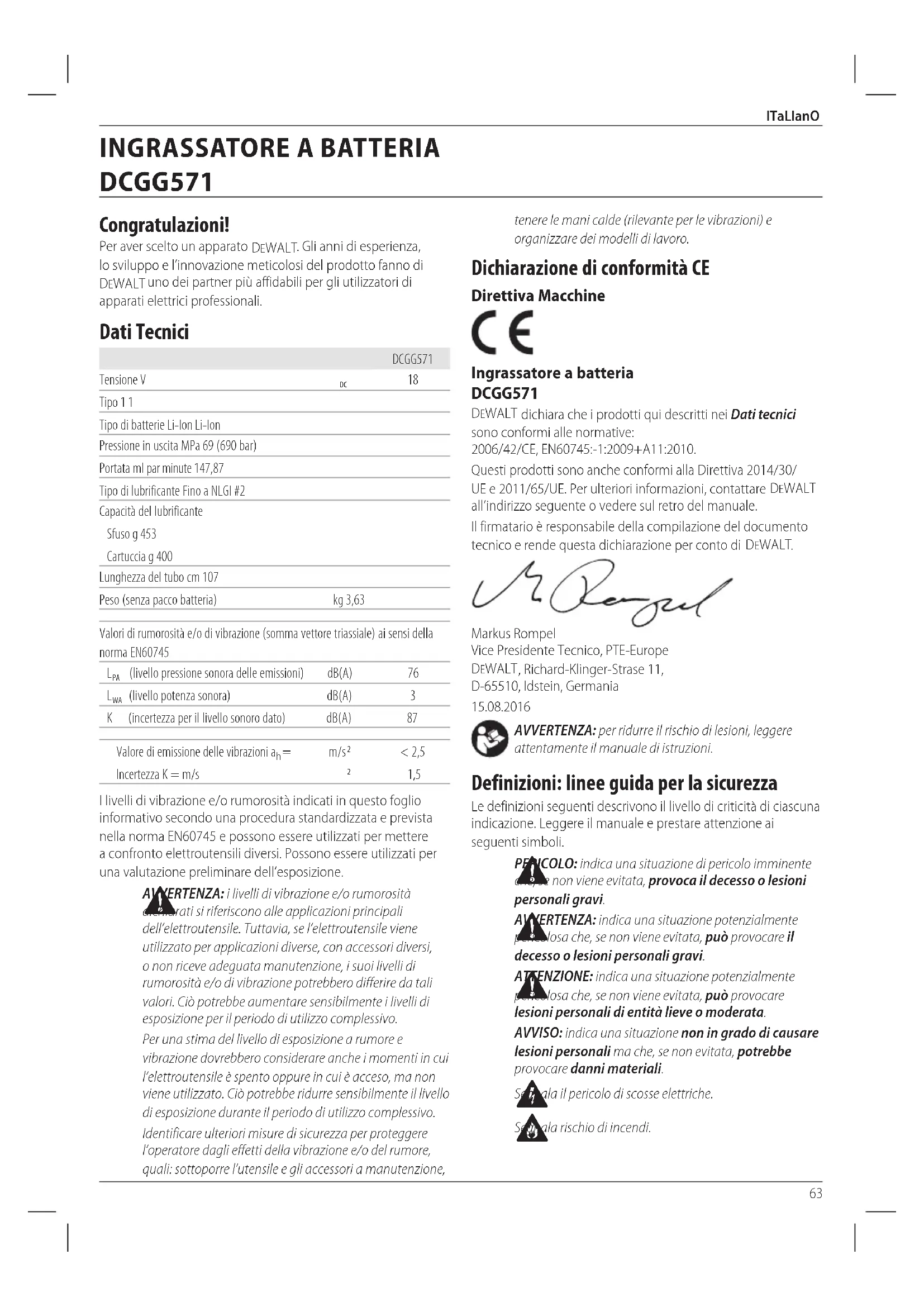all’indirizzo seguente o vedere sul retro delmanuale. Il firmatario è responsabile della compilazione del documento tecnico e rende questa dichiarazione per conto di DeWALT