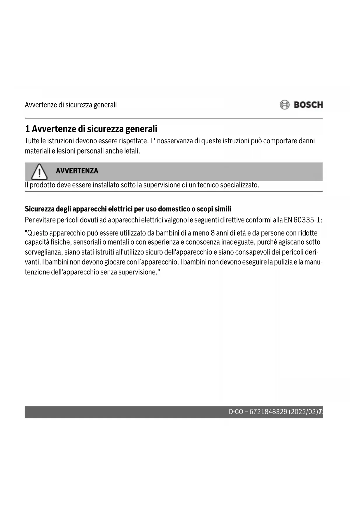 Szén-monoxid figyelmeztetés Páratartalom Öt év garancia Információ Elektromos és elektronikus berendezések hulladékai (WEE) – Európai irányelv (2012/19/EU) Telepítés Terméktípus Karbantartás Elem, akkumulátor élettartam Figyelmeztetés Hőmérséklet Életveszély xAvvertenze di sicurezza generali D-CO – 6721848329 (2022/02)72 1 Avvertenze di sicurezza generali Tutte le istruzioni devono essere rispettate. L'inosservanza di queste istruzioni può comportare danni materiali e lesioni personali anche letali. AVVERTENZA Il prodotto deve essere installato sotto la supervisione di un tecnico specializzato. Sicurezza degli apparecchi elettrici per uso domestico o scopi simili Per evitare pericoli dovuti ad apparecchi elettrici valgono le seguenti direttive conformi alla EN 60335-1: "Questo apparecchio può essere utilizzato da bambini di almeno 8 anni di età e da persone con ridotte capacità fisiche, sensoriali o mentali o con esperienza e conoscenza inadeguate, purché agiscano sotto sorveglianza, siano stati istruiti all'utilizzo sicuro dell'apparecchio e siano consapevoli dei pericoli deri- vanti. I bambini non devono giocare con l’apparecchio. I bambini non devono eseguire la pulizia e la manu- tenzione dell'apparecchio senza supervisione."Avvertenze di sicurezza generali 73D-CO – 6721848329 (2022/02) Pericolo di morte per monossido di carbonio Il monossido di carbonio (CO) è un gas velenoso che si produce durante la combustione incompleta di combustibili fossili, come petrolio, gas o combustibili solidi. I pericoli derivano dall’eventuale fuoriuscita di CO dall’impianto di riscaldamento a causa di una disfun- zione o di una perdita e dal suo accumulo non rilevato in spazi chiusi. Il monossido di carbonio è invisibile, insapore e inodore. Il dispositivo non garantisce protezione dagli effetti cronici dovuti all’esposizione a CO. Il prodotto non protegge completamente le persone esposte a rischi particolari. L’impianto di riscaldamento deve essere ispezionato e sottoposto a manutenzione a intervalli regolari da un'azienda specializzata autorizzata. AVVERTENZA L’installazione dell'allarme non esonera dall’adempimento delle corrette operazioni di installazione, eser- cizio e manutenzione di apparecchi a combustione di combustibili fossili, inclusa l’installazione di ade- guati sistemi di ventilazione e di evacuazione dei prodotti della combustione.Avvertenze di sicurezza generali D-CO – 6721848329 (2022/02)74 Che cosa fare in caso di attivazione di un allarme di monossido di carbonio ▶ Mantenere la calma e aprire tutte le porte e le finestre per favorire la ventilazione ▶ Interrompere l’utilizzo di tutti gli apparecchi a combustione di combustibili fossili e assicurarsi, se possibile, che siano spenti. Ad esempio, isolare la valvola di controllo di emergenza degli apparecchi a gas. ▶ Se l’allarme non si interrompe, uscire dall’edificio e rientrare soltanto quando si sarà spento. In edifici a più piani e plurifamiliari avvertire del rischio gli altri occupanti ▶ Richiedere assistenza medica qualora qualcuno presenti sintomi di intossicazione da monossido di carbonio e avvisare che si tratta di un caso di sospetta inalazione di monossido di carbonio. ▶ Mettersi in contatto con l’azienda responsabile della manutenzione e/o assistenza. Se necessario, mettersi in contatto con il fornitore del combustibile, telefonando al numero per le emergenze, e con il fornitore nazionale dei servizi di emergenza per il gas. In questo modo sarà possibile identificare ed eliminare la fonte delle emissioni di monossido di carbonio. ▶ Non riutilizzare gli apparecchi a combustione di combustibili fossili finché non siano stati controllati e le cause non siano state chiarite da un tecnico specializzato nel rispetto delle direttive nazionali. AVVERTENZA Pericolo di morte! Nel caso in cui si decida di silenziare il dispositivo, è importante essere consapevoli del fatto che l’allarme si è attivato a causa della presenza di livelli pericolosi di monossido di carbonio e che la permanenza nell’ambiente del dispositivo è pericolosa.Informazioni sul prodotto 75D-CO – 6721848329 (2022/02) 2 Informazioni sul prodotto