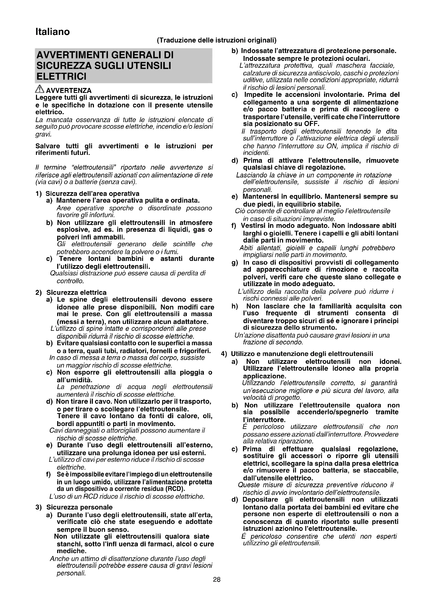 ELETTRICI AVVERTENZA Leggere tutti gli avvertimenti di sicurezza, le istruzioni e le specifi che in dotazione con il presente utensile elettrico. La mancata osservanza di tutte le istruzioni elencate di seguito può provocare scosse elettriche, incendio e/o lesioni gravi. Salvare tutti gli avvertimenti e le istruzioni per riferimenti futuri. Il termine “elettroutensili” riportato nelle avvertenze si riferisce agli elettroutensili azionati con alimentazione di rete (via cavi) o a batterie (senza cavi).