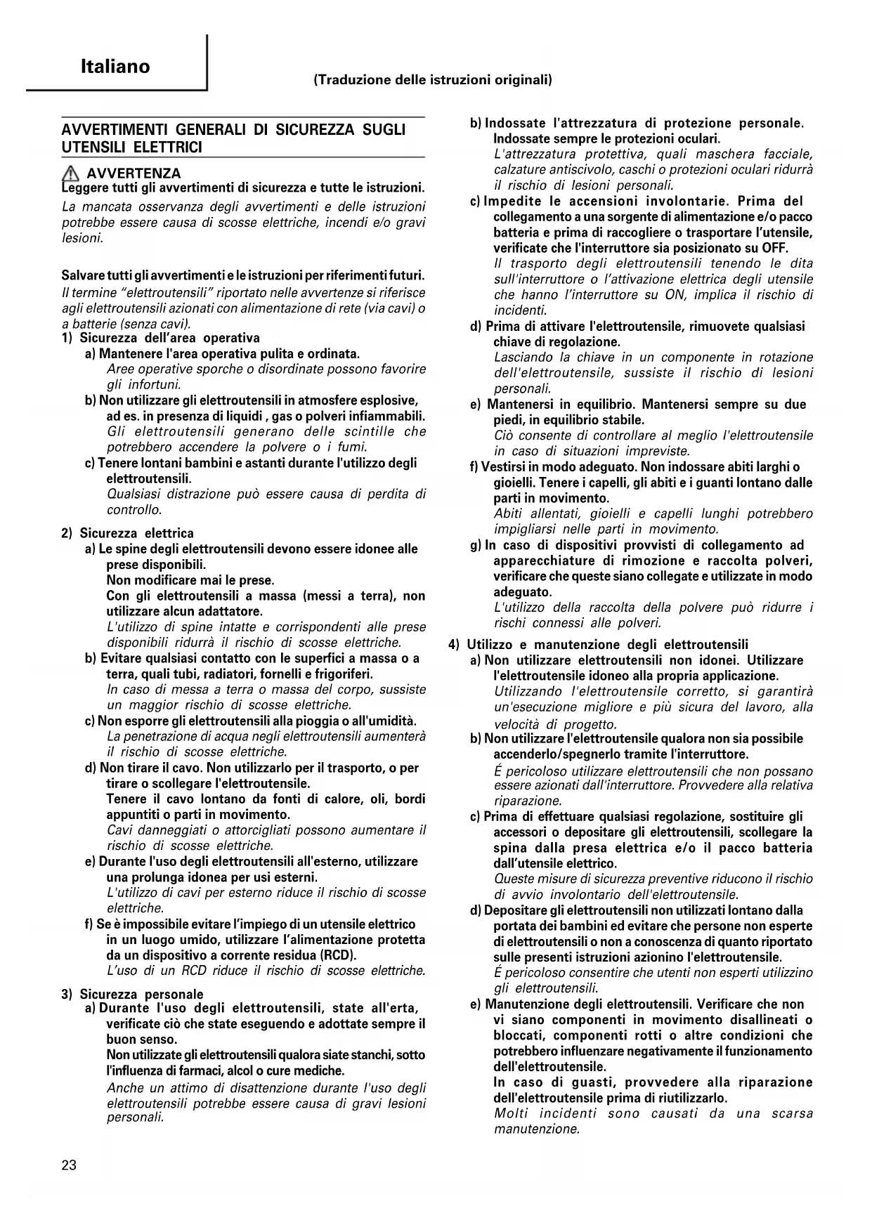 UTENSILI ELETTRICI AVVERTENZA Leggere tutti gli avvertimenti di sicurezza e tutte le istruzioni. La mancata osservanza degli avvertimenti e delle istruzioni potrebbe essere causa di scosse elettriche, incendi e/o gravi lesioni. Salvare tutti gli avvertimenti e le istruzioni per riferimenti futuri. Il termine “elettroutensili” riportato nelle avvertenze si riferisce agli elettroutensili azionati con alimentazione di rete (via cavi) o a batterie (senza cavi).