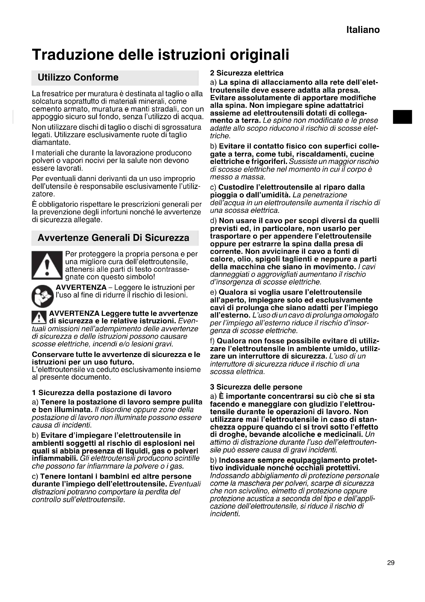Traduzione delle istruzioni originali La fresatrice per muratura è destinata al taglio o alla solcatura soprattutto di materiali minerali, come cemento armato, muratura e manti stradali, con un appoggio sicuro sul fondo, senza l’utilizzo di acqua. Non utilizzare dischi di taglio o dischi di sgrossatura legati. Utilizzare esclusivamente ruote di taglio diamantate. I materiali che durante la lavorazione producono polveri o vapori nocivi per la salute non devono essere lavorati. Per eventuali danni derivanti da un uso improprio dell’utensile è responsabile esclusivamente l’utiliz- zatore. È obbligatorio rispettare le prescrizioni generali per la prevenzione degli infortuni nonché le avvertenze di sicurezza allegate. Per proteggere la propria persona e per una migliore cura dell’elettroutensile, attenersi alle parti di testo contrasse- gnate con questo simbolo! AVVERTENZA – Leggere le istruzioni per l’uso al fine di ridurre il rischio di lesioni. AVVERTENZA Leggere tutte le avvertenze di sicurezza e le relative istruzioni. Even- tuali omissioni nell’adempimento delle avvertenze di sicurezza e delle istruzioni possono causare scosse elettriche, incendi e/o lesioni gravi. Conservare tutte le avvertenze di sicurezza e le istruzioni per un uso futuro. L’elettroutensile va ceduto esclusivamente insieme al presente documento. 1 Sicurezza della postazione di lavoro a) Tenere la postazione di lavoro sempre pulita e ben illuminata. Il disordine oppure zone della postazione di lavoro non illuminate possono essere causa di incidenti. b) Evitare d’impiegare l’elettroutensile in ambienti soggetti al rischio di esplosioni nei quali si abbia presenza di liquidi, gas o polveri infiammabili. Gli elettroutensili producono scintille che possono far infiammare la polvere o i gas. c) Tenere lontani i bambini ed altre persone durante l’impiego dell’elettroutensile. Eventuali distrazioni potranno comportare la perdita del controllo sull’elettroutensile. 2 Sicurezza elettrica a) La spina di allacciamento alla rete dell’elet- troutensile deve essere adatta alla presa. Evitare assolutamente di apportare modifiche alla spina. Non impiegare spine adattatrici assieme ad elettroutensili dotati di collega- mento a terra. Le spine non modificate e le prese adatte allo scopo riducono il rischio di scosse elet- triche. b) Evitare il contatto fisico con superfici colle- gate a terra, come tubi, riscaldamenti, cucine elettriche e frigoriferi. Sussiste un maggior rischio di scosse elettriche nel momento in cui il corpo è messo a massa. c) Custodire l’elettroutensile al riparo dalla pioggia o dall’umidità. La penetrazione dell’acqua in un elettroutensile aumenta il rischio di una scossa elettrica. d) Non usare il cavo per scopi diversi da quelli previsti ed, in particolare, non usarlo per trasportare o per appendere l’elettroutensile oppure per estrarre la spina dalla presa di corrente. Non avvicinare il cavo a fonti di calore, olio, spigoli taglienti e neppure a parti della macchina che siano in movimento. I cavi danneggiati o aggrovigliati aumentano il rischio d’insorgenza di scosse elettriche. e) Qualora si voglia usare l’elettroutensile all’aperto, impiegare solo ed esclusivamente cavi di prolunga che siano adatti per l’impiego all’esterno. L’uso di un cavo di prolunga omologato per l’impiego all’esterno riduce il rischio d’insor- genza di scosse elettriche. f) Qualora non fosse possibile evitare di utiliz- zare l’elettroutensile in ambiente umido, utiliz- zare un interruttore di sicurezza. L’uso di un interruttore di sicurezza riduce il rischio di una scossa elettrica. 3 Sicurezza delle persone a) È importante concentrarsi su ciò che si sta facendo e maneggiare con giudizio l’elettrou- tensile durante le operazioni di lavoro. Non utilizzare mai l’elettroutensile in caso di stan- chezza oppure quando ci si trovi sotto l’effetto di droghe, bevande alcoliche e medicinali. Un attimo di distrazione durante l’uso dell’elettrouten- sile può essere causa di gravi incidenti. b) Indossare sempre equipaggiamento protet- tivo individuale nonché occhiali protettivi. Indossando abbigliamento di protezione personale come la maschera per polveri, scarpe di sicurezza che non scivolino, elmetto di protezione oppure protezione acustica a seconda del tipo e dell’appli- cazione dell’elettroutensile, si riduce il rischio di incidenti. Utilizzo Conforme Avvertenze Generali Di Sicurezza 000book_CM5MA.book 29 ページ 2022年7月20日 水曜日 午後4時50分Italiano