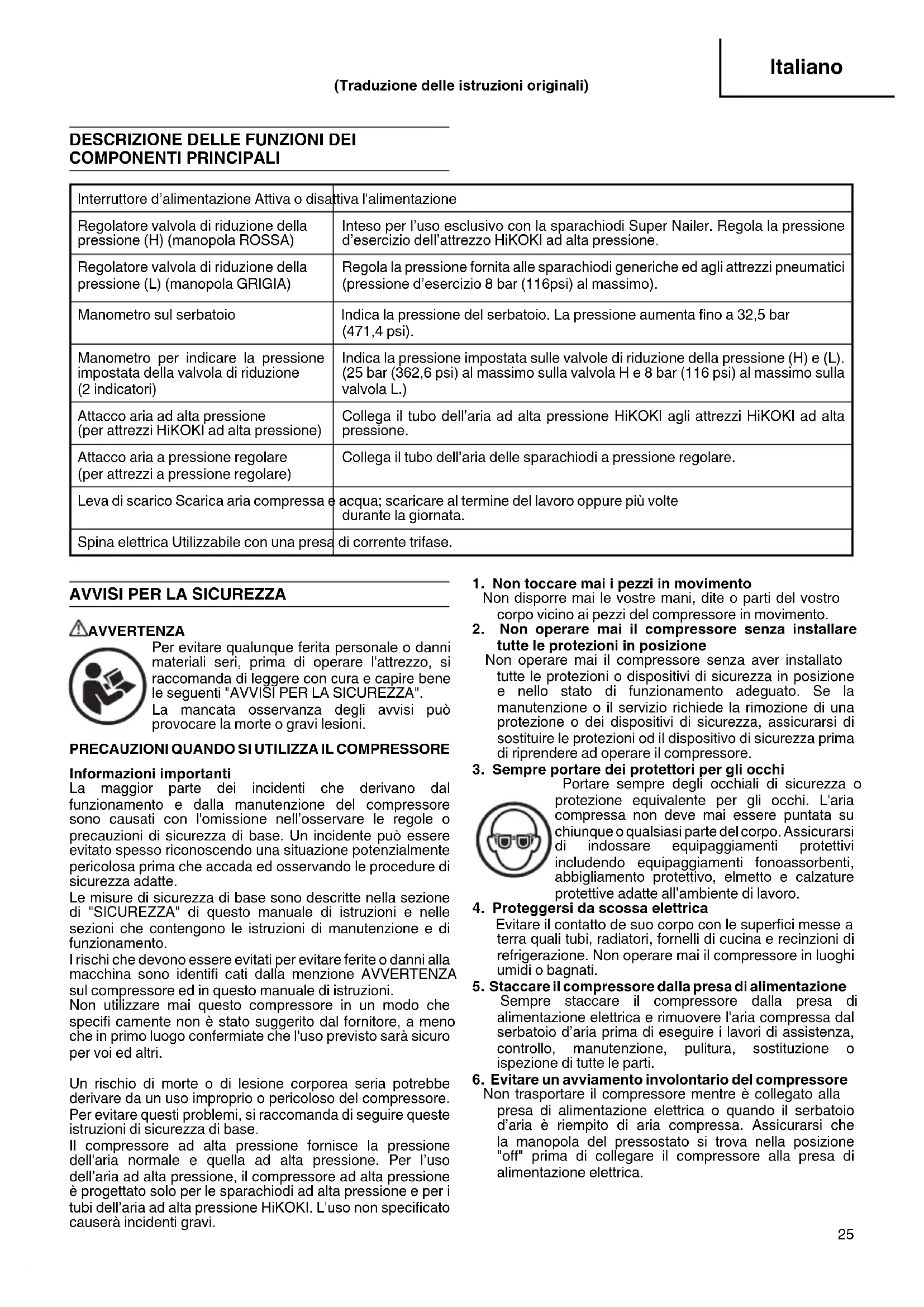 Informazioni importanti La maggior parte dei incidenti che derivano dal funzionamento e dalla manutenzione del compressore sono causati con l'omissione nell’osservare le regole o precauzioni di sicurezza di base. Un incidente può essere evitato spesso riconoscendo una situazione potenzialmente pericolosa prima che accada ed osservando le procedure di sicurezza adatte. Le misure di sicurezza di base sono descritte nella sezione di "SICUREZZA" di questo manuale di istruzioni e nelle sezioni che contengono le istruzioni di manutenzione e di funzionamento. I rischi che devono essere evitati per evitare ferite o danni alla macchina sono identifi cati dalla menzione AVVERTENZA sul compressore ed in questo manuale di istruzioni. Non utilizzare mai questo compressore in un modo che specifi camente non è stato suggerito dal fornitore, a meno che in primo luogo confermiate che l'uso previsto sarà sicuro per voi ed altri. Un rischio di morte o di lesione corporea seria potrebbe derivare da un uso improprio o pericoloso del compressore. Per evitare questi problemi, si raccomanda di seguire queste istruzioni di sicurezza di base. Il compressore ad alta pressione fornisce la pressione dell'aria normale e quella ad alta pressione. Per l’uso dell’aria ad alta pressione, il compressore ad alta pressione è progettato solo per le sparachiodi ad alta pressione e per i tubi dell’aria ad alta pressione HiKOKI. L'uso non specifi cato causerà incidenti gravi.