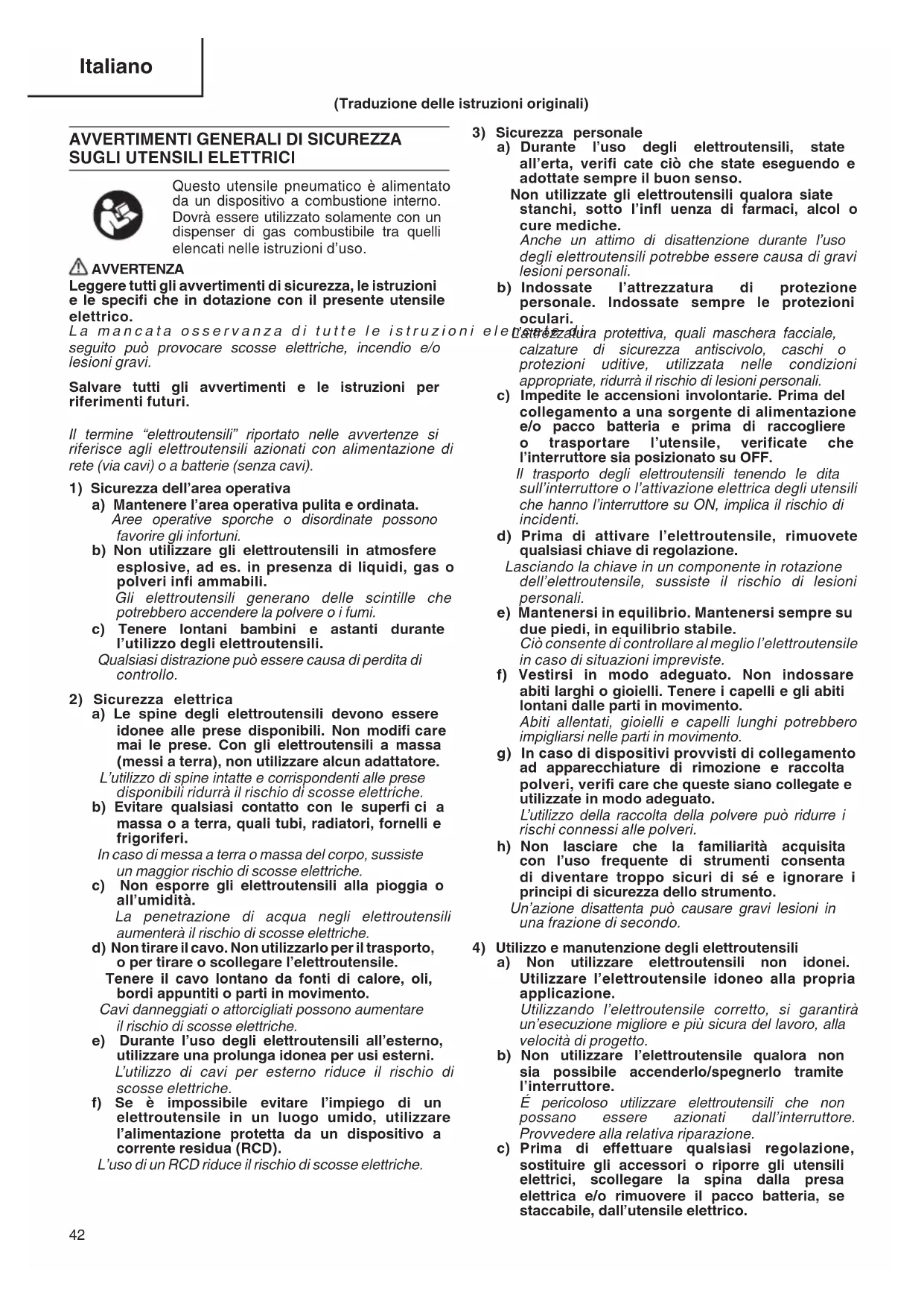 Questo utensile pneumatico è alimentato da un dispositivo a combustione interno. Dovrà essere utilizzato solamente con un dispenser di gas combustibile tra quelli elencati nelle istruzioni d’uso. AVVERTENZA Leggere tutti gli avvertimenti di sicurezza, le istruzioni e le specifi che in dotazione con il presente utensile elettrico. La mancata osservanza di tutte le istruzioni elencate di seguito può provocare scosse elettriche, incendio e/o lesioni gravi. Salvare tutti gli avvertimenti e le istruzioni per riferimenti futuri. Il termine “elettroutensili” riportato nelle avvertenze si riferisce agli elettroutensili azionati con alimentazione di rete (via cavi) o a batterie (senza cavi).