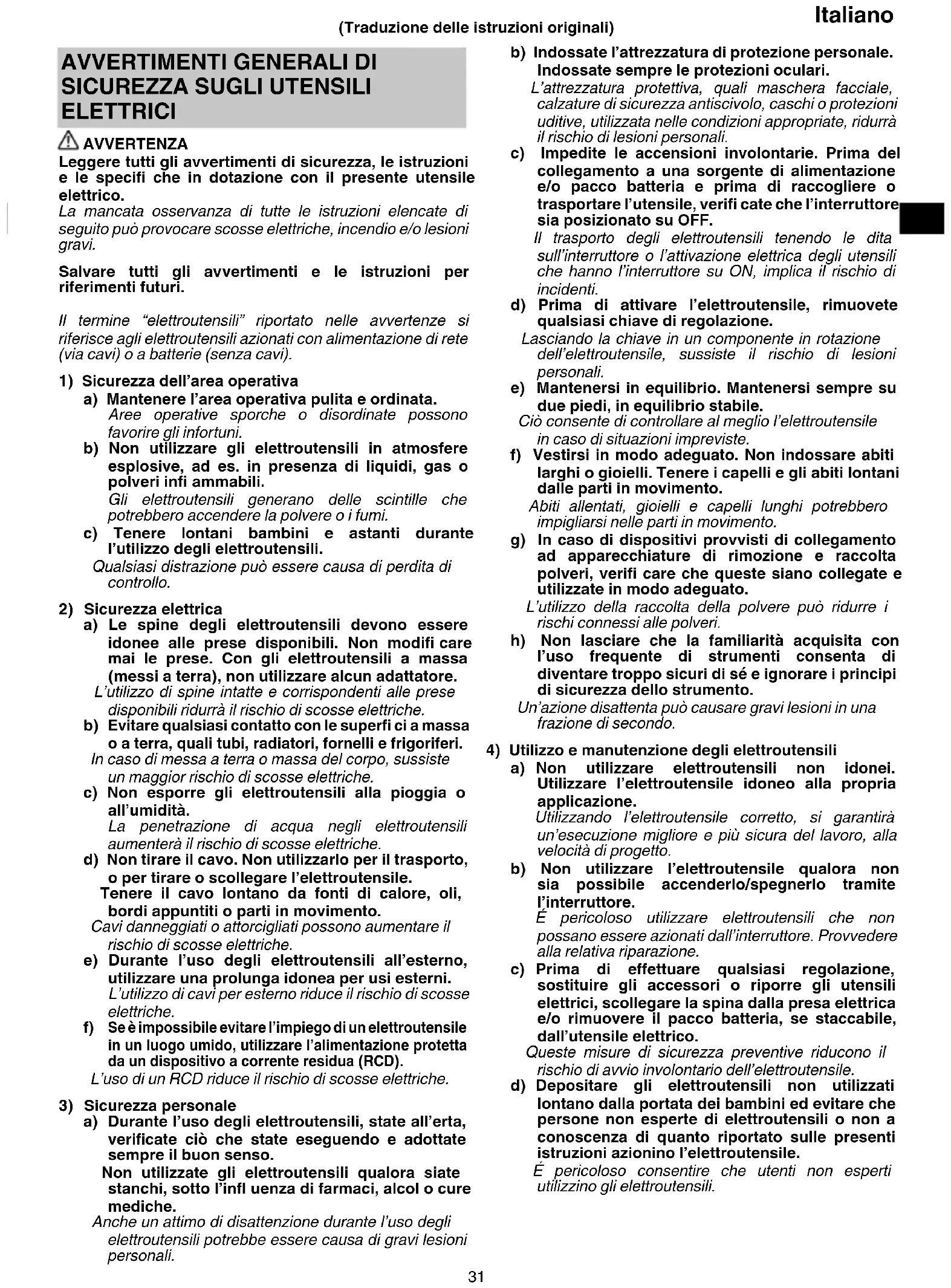 ELETTRICI AVVERTENZA Leggere tutti gli avvertimenti di sicurezza, le istruzioni e le specifi che in dotazione con il presente utensile elettrico. La mancata osservanza di tutte le istruzioni elencate di seguito può provocare scosse elettriche, incendio e/o lesioni gravi. Salvare tutti gli avvertimenti e le istruzioni per riferimenti futuri. Il termine “elettroutensili” riportato nelle avvertenze si riferisce agli elettroutensili azionati con alimentazione di rete (via cavi) o a batterie (senza cavi).