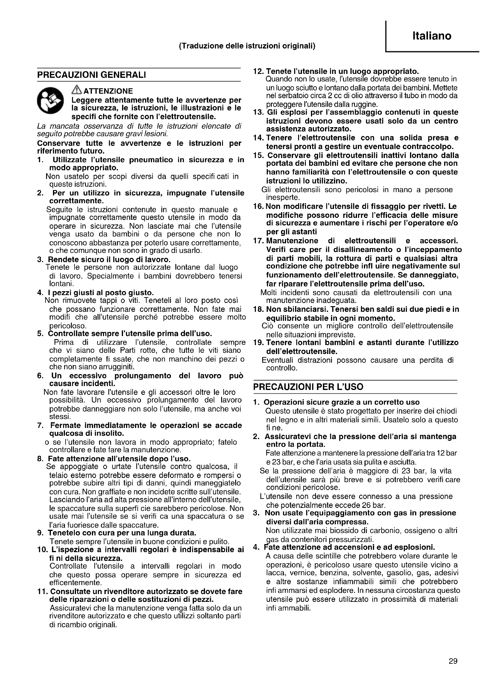 ATTENZIONE ○ Non usare il corpo o qualsiasi parte dell’utensile come martello poiché i chiodi potrebbero venire scaricati inaspettatamente o l’utensile potrebbe restare danneggiato e potrebbero verifi carsi lesioni gravi. ○ Prendete le precauzioni per salvaguardare la sicurezza delle persone nelle vicinanze delle operazioni. ○ Assicurarsi che l’utensile sia sempre inserito in modo sicuro sul pezzo in lavorazione e non possa scivolare. ○ Mai trasportare un utensile pneumatico dal suo tubo fl essibile. ○ Mai trascinare un utensile pneumatico dal suo tubo fl essibile.