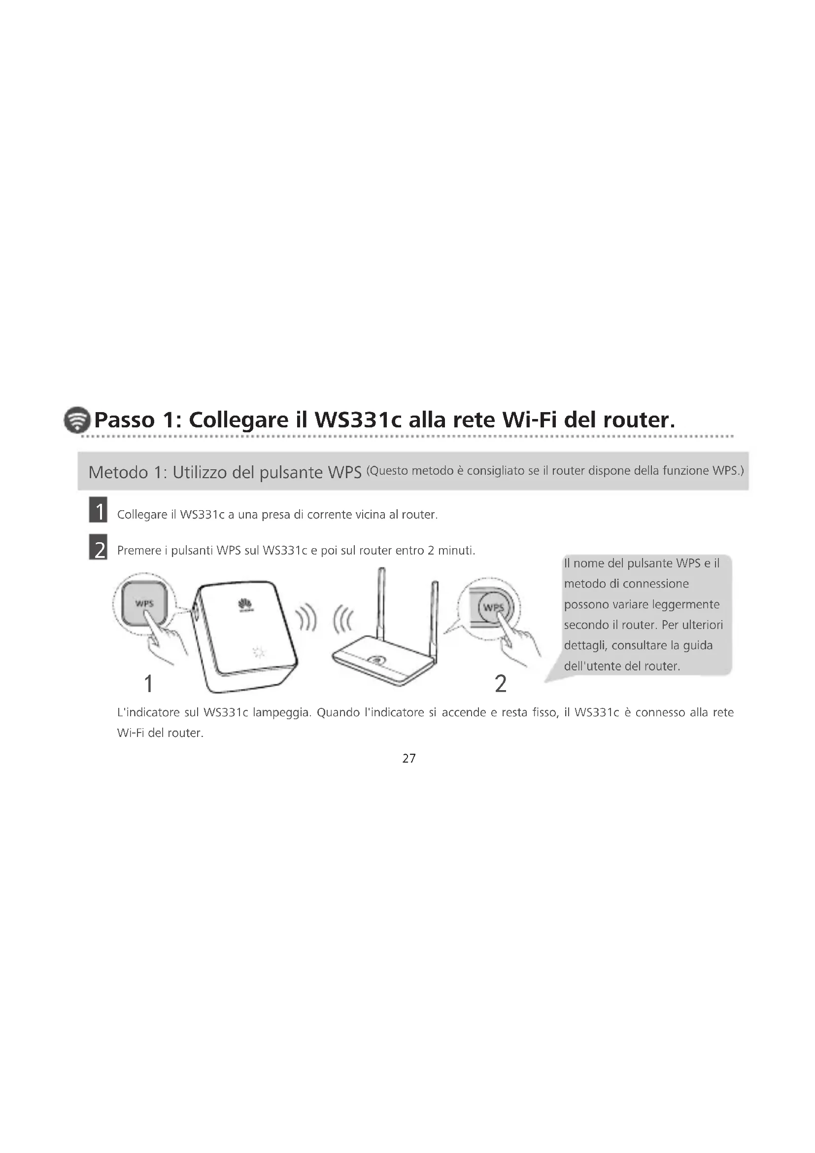 Collegare il WS331c a una presa di corrente vicina al router. Premere i pulsanti WPS sul WS331c e poi sul router entro 2 minuti. L'indicatore sul WS331c lampeggia. Quando l'indicatore si accende e resta fisso, il WS331c è connesso alla rete Wi-Fi del router. Metodo 1: Utilizzo del pulsante WPS (Questo metodo è consigliato se il router dispone della funzione WPS.) Il nome del pulsante WPS e il metodo di connessione possono variare leggermente secondo il router. Per ulteriori dettagli, consultare la guida dell'utente del router.