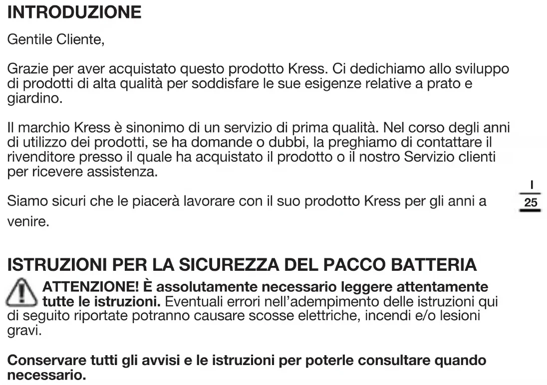 INTRODUZIONE Gentile Cliente, Grazie per aver acquistato questo prodotto Kress. Ci dedichiamo allo sviluppo di prodotti di alta qualità per soddisfare le sue esigenze relative a prato e giardino. Il marchio Kress è sinonimo di un servizio di prima qualità. Nel corso degli anni di utilizzo dei prodotti, se ha domande o dubbi, la preghiamo di contattare il rivenditore presso il quale ha acquistato il prodotto o il nostro Servizio clienti per ricevere assistenza. Siamo sicuri che le piacerà lavorare con il suo prodotto Kress per gli anni a venire. ISTRUZIONI PER LA SICUREZZA DEL PACCO BATTERIA ATTENZIONE! È assolutamente necessario leggere attentamente tutte le istruzioni. Eventuali errori nell’adempimento delle istruzioni qui di seguito riportate potranno causare scosse elettriche, incendi e/o lesioni gravi. Conservare tutti gli avvisi e le istruzioni per poterle consultare quando necessario.26