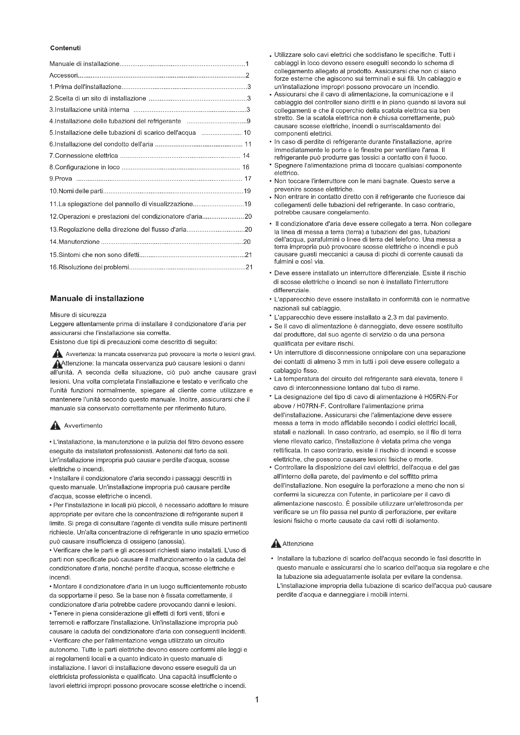 HTW-MI2112T1DN1 | HTW-MI2160T1DN1 | HTW-MI2280T1DN1 HTW-MI2400T1DN1 | HTW-MI2450T1DN1| HTW-MI2560T1DN1Avvertenza: la mancata osservanza può provocare la morte o lesioni gravi. Attenzione: la mancata osservanza può causare lesioni o danni all'unità. A seconda della situazione, ciò può anche causare gravi lesioni. Una volta completata l'installazione e testato e verificato che l'unità funzioni normalmente, spiegare al cliente come utilizzare e mantenere l'unità secondo questo manuale. Inoltre, assicurarsi che il manuale sia conservato correttamente per riferimento futuro. Attenzione Contenuti