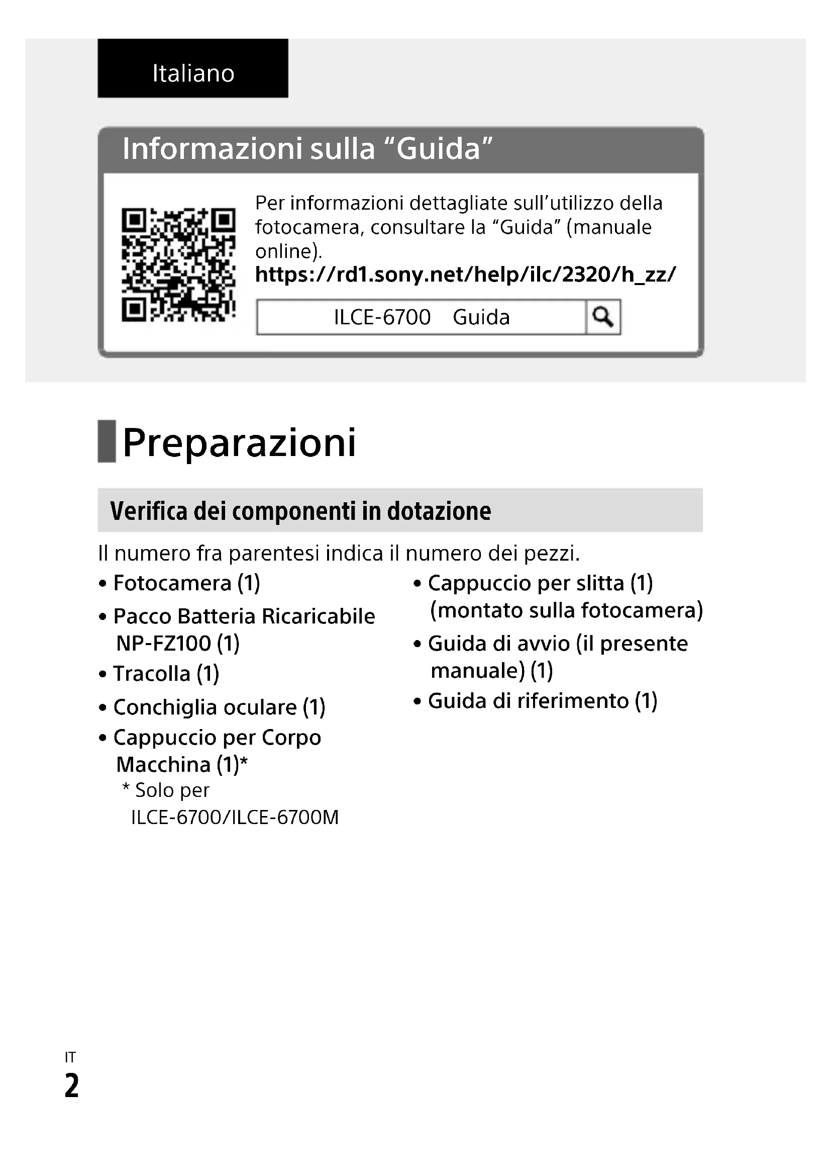 Informazioni sulla “Guida” Per informazioni dettagliate sull’utilizzo della fotocamera, consultare la “Guida” (manuale online).https://rd1.sony.net/help/ilc/2320/h_zz/ILCE-6700 Guida Italiano Preparazioni Verifica dei componenti in dotazione Il numero fra parentesi indica il numero dei pezzi.• Fotocamera (1)• Pacco Batteria Ricaricabile NP-FZ100 (1)• Tracolla (1)• Conchiglia oculare (1)• Cappuccio per Corpo Macchina (1)** Solo per ILCE-6700/ILCE-6700M• Cappuccio per slitta (1) (montato sulla fotocamera)• Guida di avvio (il presente manuale) (1)• Guida di riferimento (1)IT