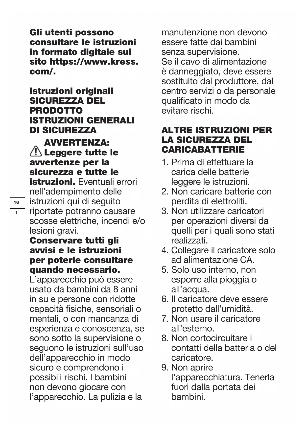 Gli utenti possono consultare le istruzioni in formato digitale sul sito https://www.kress. com/. Istruzioni originali SICUREZZA DEL PRODOTTO ISTRUZIONI GENERALI DI SICUREZZA AVVERTENZA: Leggere tutte le avvertenze per la sicurezza e tutte le istruzioni. Eventuali errori nell’adempimento delle istruzioni qui di seguito riportate potranno causare scosse elettriche, incendi e/o lesioni gravi. Conservare tutti gli avvisi e le istruzioni per poterle consultare quando necessario. L’apparecchio può essere usato da bambini da 8 anni in su e persone con ridotte capacità siche, sensoriali o mentali, o con mancanza di esperienza e conoscenza, se sono sotto la supervisione o seguono le istruzioni sull’uso dell’apparecchio in modo sicuro e comprendono i possibili rischi. I bambini non devono giocare con l’apparecchio. La pulizia e la manutenzione non devono essere fatte dai bambini senza supervisione. Se il cavo di alimentazione è danneggiato, deve essere sostituito dal produttore, dal centro servizi o da personale qualicato in modo da evitare rischi.