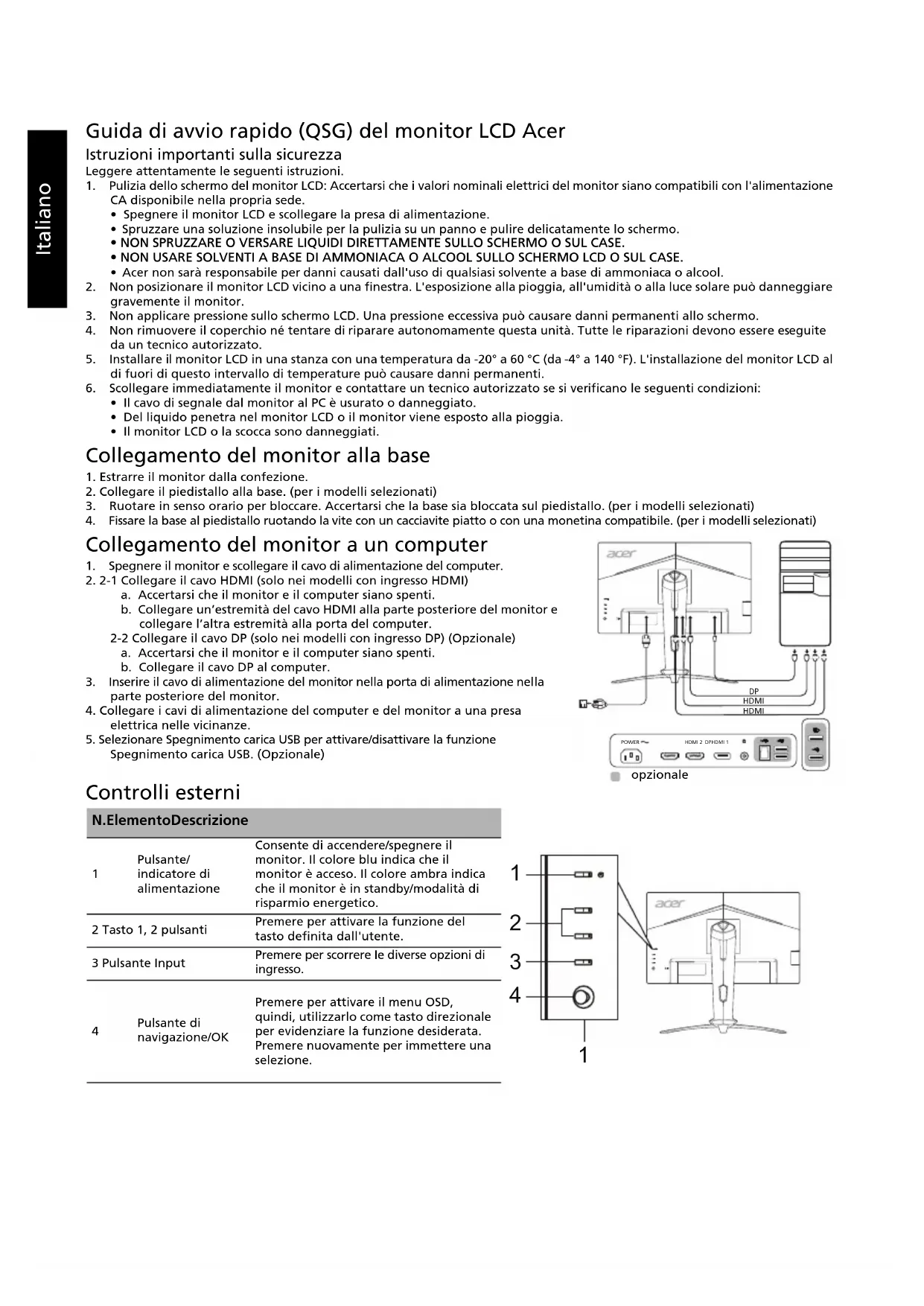 4Italiano Norme e avvisi di sicurezza Normative FCC Questo dispositivo è stato testato ed è risultato conforme ai limiti stabiliti per i dispositivi digitali di Classe B, ai sensi della Parte 15 delle Normative FCC. Tali limiti sono stati stabiliti per fornire una ragionevole protezione da interferenze nocive presenti nelle installazioni residenziali. Questo dispositivo genera, utilizza e può emettere frequenze radio, e se non è installato e utilizzato secondo le istruzioni, può causare un'interferenza dannosa alle comunicazioni radio. Tuttavia, non vi è alcuna garanzia che l'interferenza non si verifichi in particolari installazioni. Se il dispositivo causa un'interferenza dannosa alla ricezione di radio e televisori, che può essere determinata spegnendo e accendendo il dispositivo, si prega l'utente di correggere l'interferenza applicando una o più delle seguenti misure: Riorientare o riposizionare l'antenna di ricezione. Aumentare la distanza tra il dispositivo e il ricevitore. Collegare il dispositivo a una presa su un circuito diverso da quello a cui è collegato il ricevitore. Per assistenza, contattare il rivenditore o un tecnico professionista nell'ambito di radio e televisori. Dichiarazione di conformità CE Con il presente documento, Acer Inc., dichiara che questo monitor LCD è conforme ai requisiti essenziali e ad altre normative pertinenti della Direttiva EMC 2014/30/UE, alla Direttiva sulla bassa tensione 2014/35/UE e alla Direttiva RoHS 2011/65/UE e alla Direttiva 2009/125/CE con riferimento all'istituzione di un quadro per l'elaborazione di specifiche per la progettazione ecocompatibile dei prodotti connessi al consumo energetico. Avviso: Per impedire danni al monitor, non sollevare il monitor per la sua base. Avviso: Cavi schermati Tutte i collegamenti ad altri dispositivi di elaborazione devono essere effettuati utilizzando cavi schermati per mantenere la conformità alle normative EMC. Avviso: Dispositivi periferici È possibile collegare a questa apparecchiatura solo le periferiche (dispositivi in ingresso/uscita, terminali, stampanti, ecc.) certificate per la conformità ai limiti della Classe B. L'uso di periferiche non certificate può causare interferenze alla ricezione di radio e TV. Avvertenza Eventuali modifiche o cambiamenti non espressamente approvati dal produttore potrebbero annullare l'autorità dell'utente, concessa dalla Federal Communications Commission, a utilizzare questo prodotto. Condizioni di utilizzo Questo dispositivo è conforme alla Parte 15 delle Normative FCC. L'utilizzo è soggetto alle seguenti due condizioni: (1) il dispositivo non deve causare interferenze dannose e (2) deve accettare tutte le interferenze ricevute, comprese quelle che possono causare un funzionamento indesiderato. Avviso: Utenti canadesi Questo apparecchio digitale di classe B è conforme alla normativa canadese ICES-003. Remarque à l'intention des utilisateurs canadiens Cet appareil numérique de la classe B est conforme à la norme NMB-003 du Canada. Smaltimento dei dispositivi utilizzati da parte di utenti privati nell'Unione Europea Questo simbolo sul prodotto o sulla confezione indica che il prodotto non deve essere smaltito insieme ai rifiuti domestici. È quindi responsabilità dell'utente smaltirlo portandolo presso un centro di raccolta autorizzato per il riciclo delle apparecchiature elettriche ed elettroniche. La raccolta differenziata e il riciclaggio di tali rifiuti provenienti da apparecchiature nel momento dello smaltimento aiuteranno a preservare le risorse naturali e garantiranno un riciclaggio adatto a proteggere il benessere dell'uomo e dell'ambiente. Per maggiori informazioni sui centri di raccolta, contattare il proprio ufficio locale, il servizio di smaltimento rifiuti o il negozio presso il quale è stato acquistato il prodotto.Italiano SPECIFICHE I manuali e altri documenti relativi al prodotto Acer sono disponibili sul sito Web di assistenza ufficiale Acer.
