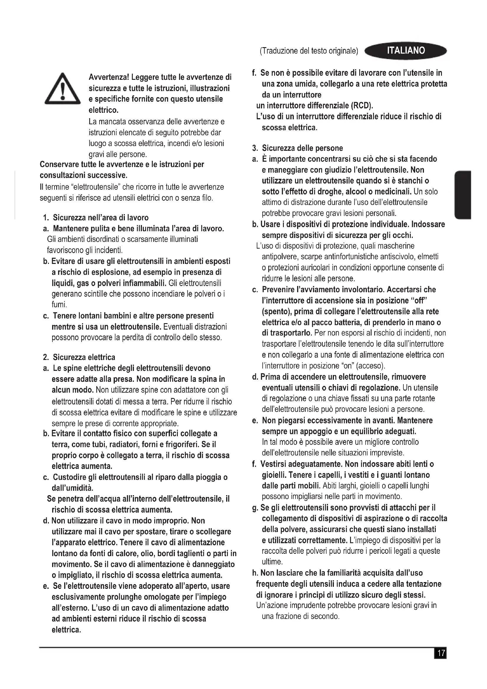 Meno: polo negativo Istruzioni di sicurezza za generali per gli elettroutensili17 (Traduzione del testo originale) ITALIANO Avvertenza! Leggere tutte le avvertenze di sicurezza e tutte le istruzioni, illustrazioni e speciche fornite con questo utensile elettrico. La mancata osservanza delle avvertenze e istruzioni elencate di seguito potrebbe dar luogo a scossa elettrica, incendi e/o lesioni gravi alle persone. Conservare tutte le avvertenze e le istruzioni per consultazioni successive. Il termine “elettroutensile” che ricorre in tutte le avvertenze seguenti si riferisce ad utensili elettrici con o senza lo.