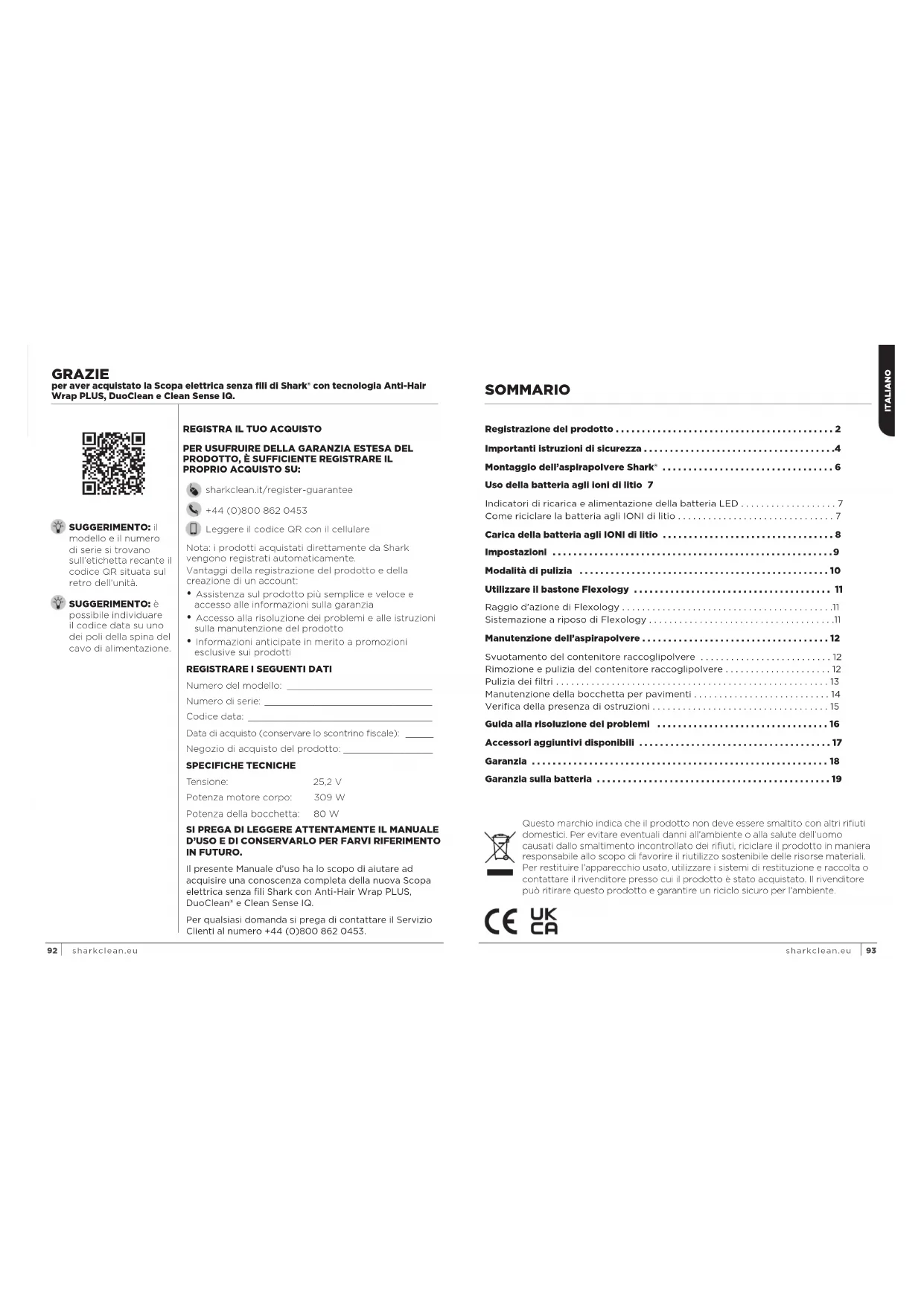 PROPRIO ACQUISTO SU: sharkclean.it/register-guarantee +44(0)8008620453 Leggere il codice QR con il cellulare GRAZIE per aver acquistato la Scopa elettrica senza fili di Shark® con tecnologia Anti-Hair Wrap PLUS, DuoClean e Clean Sense IQ. SI PREGA DI LEGGERE ATTENTAMENTE IL MANUALE D’USO E DI CONSERVARLO PER FARVI RIFERIMENTO IN FUTURO. Il presente Manuale d’uso ha lo scopo di aiutare ad acquisire una conoscenza completa della nuova Scopa elettrica senza fili Shark con Anti-Hair Wrap PLUS, DuoClean® e Clean Sense IQ Per qualsiasi domanda si prega di contattare il Servizio Clienti al numero +44(0)8008620453 Vantaggi della registrazione del prodotto e della creazione di un account: