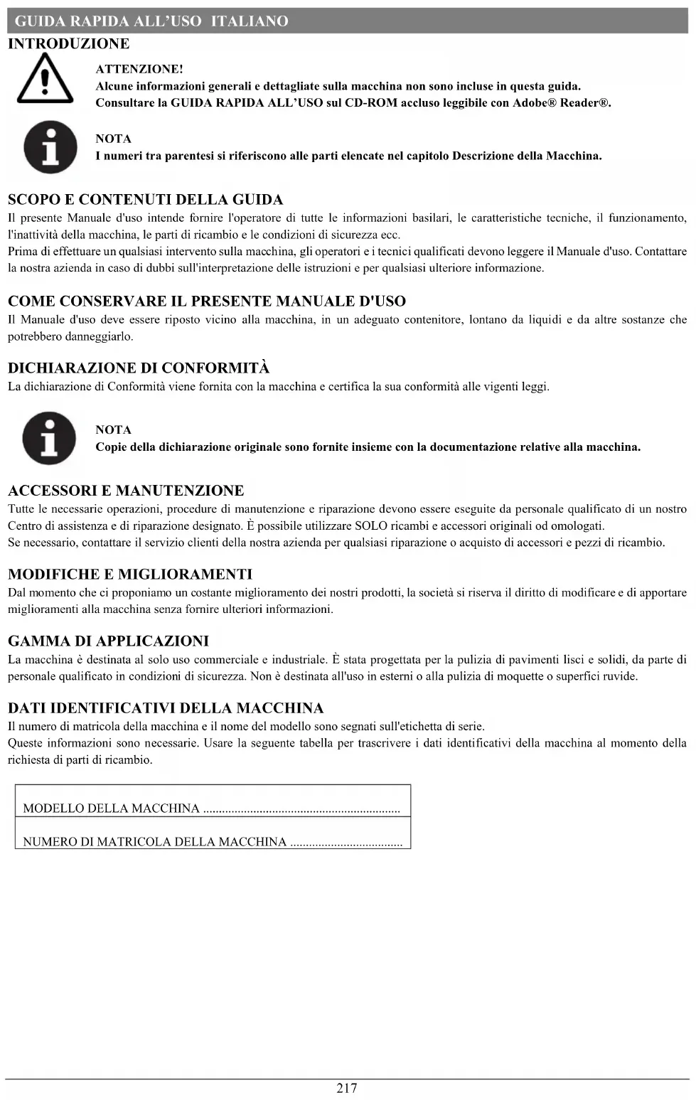 Per evitare di danneggiare il pavimento, non permettere che la spazzola/feltro sia in funzione a macchina ferma. In caso di incendio usare l'estintore a polvere e non uno a liquidi. Non rimuovere o modificare gli adesivi sulla macchina. Non alterare i dispositivi di sicurezza della macchina e seguire scrupolosamente le istruzioni per la manutenzione programmata. Durante i trasferimenti della macchina con temperature inferiori al punto di congelamento, prestare attenzione in quanto l'acqua, presente nel serbatoio acqua di recupero o nei tubi, potrebbe congelare e danneggiare seriamente la macchina. Se alcuni componenti necessitano di essere sostituiti, ordinare ricambi ORIGINALI presso Fornitori o Rivenditori Autorizzati. Se la macchina non funziona correttamente, è danneggiata, rimasta all’aperto o caduta nell’acqua, portarla presso un Centro di assistenza. Per garantire un funzionamento appropriato e sicuro della macchina, la manutenzione programmata indicata nell'apposito capitolo di questo Manuale deve essere puntualmente eseguita da personale autorizzato o da un Centro di assistenza autorizzato. La macchina deve essere smaltita correttamente, per la presenza di materiali tossici-dannosi (batterie, ecc.) che sono soggetti ad apposita normativa e che richiedono lo smaltimento in centri specializzati (vedere capitolo Smaltimento). La presente macchina è esclusivamente uno strumento per la pulizia e non è destinata a utilizzi diversi. Mantenere le aperture della macchina libere da polvere, filaccia, peli e qualsiasi altro corpo estraneo che possa ridurre la ventilazione. Non usare la macchina se le aperture sono ostruite. Usare la macchina solo dove sia disponibile un'opportuna illuminazione. questa macchina non è destinata all’uso da parte di persone (compresi i bambini) con ridotte capacità fisiche, sensoriali o mentali o prive di esperienza e formazione. Porre estrema attenzione quando la si usa vicino ai bambini. I bambini dovrebbero essere supervisionati per assicurarsi che non giochino con la macchina. Mentre si usa la macchina, assicurarsi di non causare danni a persone o oggetti. La pulizia e la manutenzione della macchina non possono essere eseguite da bambini senza adeguata supervisione. Gli operatori devono ricevere adeguate istruzioni per l'utilizzo di queste macchine.GUIDA RAPIDA ALL’USO ITALIANO