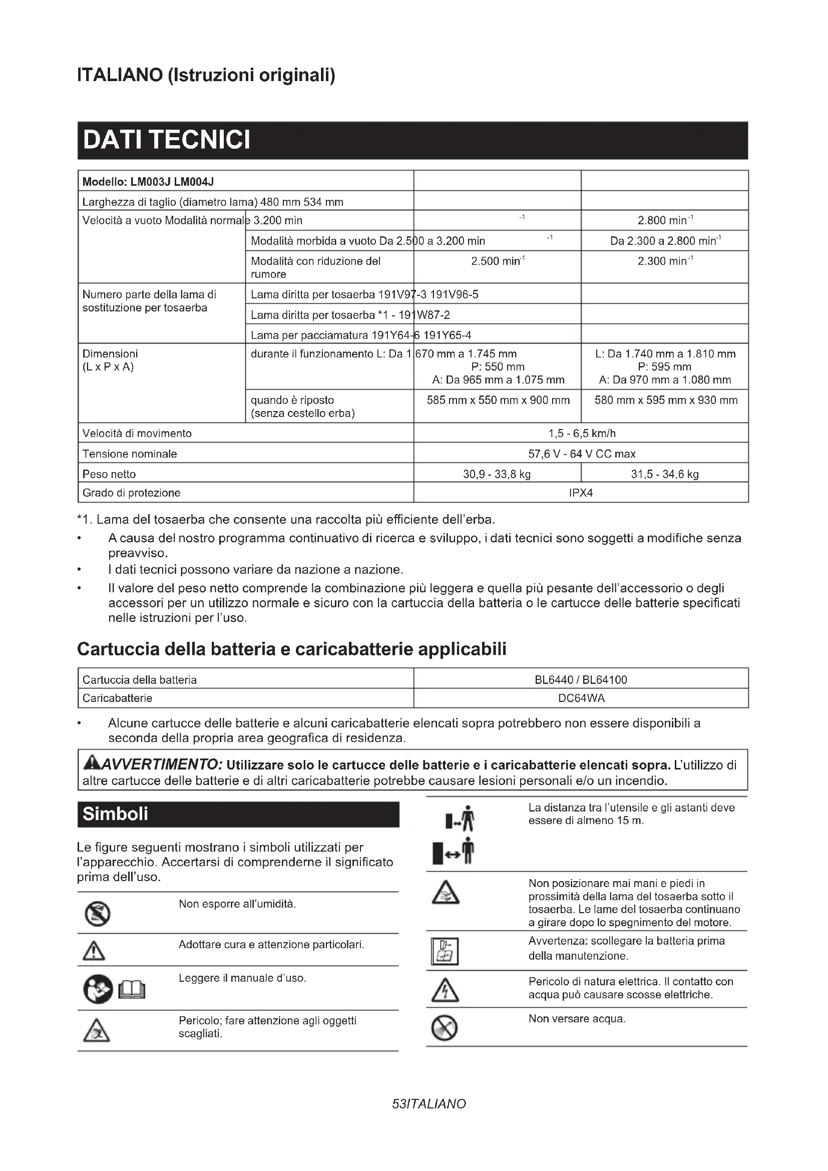 - Alcune cartucce delle batterie e alcuni caricabatterie elencati sopra potrebbero non essere disponibili a seconda della propria area geograca di residenza. AVVERTIMENTO: Utilizzare solo le cartucce delle batterie e i caricabatterie elencati sopra. L’utilizzo di altre cartucce delle batterie e di altri caricabatterie potrebbe causare lesioni personali e/o un incendio. Simboli Le gure seguenti mostrano i simboli utilizzati per l’apparecchio. Accertarsi di comprenderne il signicato prima dell’uso. Non esporre all’umidità. Adottare cura e attenzione particolari. Leggere il manuale d’uso. Pericolo; fare attenzione agli oggetti scagliati. La distanza tra l’utensile e gli astanti deve essere di almeno 15 m. Non posizionare mai mani e piedi in prossimità della lama del tosaerba sotto il tosaerba. Le lame del tosaerba continuano a girare dopo lo spegnimento del motore. Avvertenza: scollegare la batteria prima della manutenzione. Pericolo di natura elettrica. Il contatto con acqua può causare scosse elettriche. Non versare acqua.54 ITALIANO Ni-MH Li-ion Solo per le nazioni dell’EU A causa della presenza di componenti pericolosi nelle apparecchiature, i riuti di apparecchiature elettriche ed elettroniche, accumulatori e batterie potrebbero pro- durre un impatto negativo sull’ambiente e sulla salute umana. Non smaltire elettrodomestici elettrici ed elettronici o batterie insieme ai riuti domestici! In conformità alla direttiva europea sui riuti di apparecchiature elettriche ed elettroniche (RAEE), sugli accumulatori e le batterie, nonché sui riuti di accumulatori e batterie, e al suo adattamento alle nor- mative nazionali, i riuti di apparecchiature elettriche ed elettroniche, batterie e accu- mulatori vanno conservati separatamente e conferiti a un punto di raccolta separato per i riuti comunali, operando in con- formità alle normative per la protezione dell’ambiente. Tale requisito viene indicato mediante il simbolo del bidone della spazzatura con ruote barrato apposto sull’apparecchio. Livello di potenza sonora garantita in base alla Direttiva rumore macchine all’aperto UE. Livello di potenza sonora in base alla normativa sul controllo del rumore NSW australiana Utilizzo previsto La macchina è destinata alla tosatura di prati. Rumore Livello tipico di rumore pesato A determinato in base allo standard EN62841-4-3: Modello LM003J Livello di potenza sonora misurato (L
