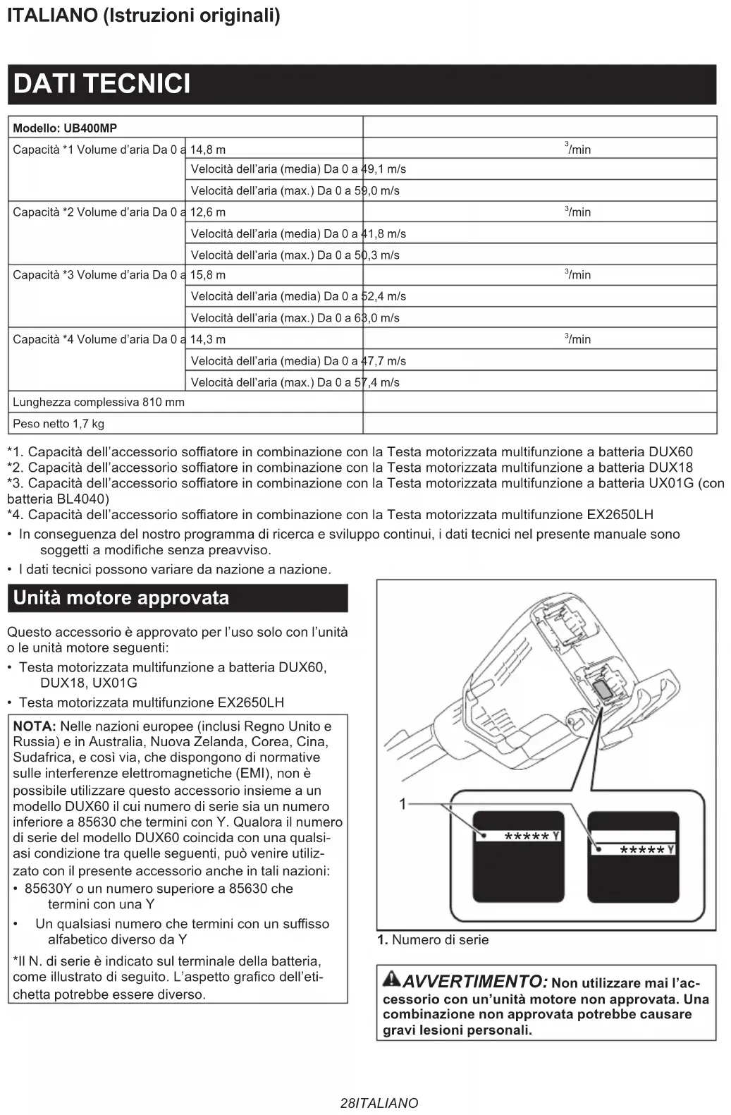/min Velocità dell’aria (media) Da 0 a 47,7 m/sVelocità dell’aria (max.) Da 0 a 57,4 m/sLunghezza complessiva 810 mmPeso netto 1,7 kg*1.Capacitàdell’accessoriosoatoreincombinazioneconlaTestamotorizzatamultifunzioneabatteriaDUX60*2.Capacitàdell’accessoriosoatoreincombinazioneconlaTestamotorizzatamultifunzioneabatteriaDUX18*3.Capacitàdell’accessoriosoatoreincombinazioneconlaTestamotorizzatamultifunzioneabatteriaUX01G(conbatteria BL4040)*4.Capacitàdell’accessoriosoatoreincombinazioneconlaTestamotorizzatamultifunzioneEX2650LH• In conseguenza del nostro programma di ricerca e sviluppo continui, i dati tecnici nel presente manuale sono soggettiamodichesenzapreavviso.• I dati tecnici possono variare da nazione a nazione. Unità motore approvata Questo accessorio è approvato per l’uso solo con l’unità o le unità motore seguenti:• Testa motorizzata multifunzione a batteria DUX60, DUX18, UX01G• Testa motorizzata multifunzione EX2650LHNOTA: Nelle nazioni europee (inclusi Regno Unito e Russia) e in Australia, Nuova Zelanda, Corea, Cina, Sudafrica, e così via, che dispongono di normative sulle interferenze elettromagnetiche (EMI), non è possibile utilizzare questo accessorio insieme a un modello DUX60 il cui numero di serie sia un numero inferiore a 85630 che termini con Y. Qualora il numero di serie del modello DUX60 coincida con una qualsi-asi condizione tra quelle seguenti, può venire utiliz-zato con il presente accessorio anche in tali nazioni:• 85630Y o un numero superiore a 85630 che termini con una Y• Unqualsiasinumerocheterminiconunsussoalfabetico diverso da Y*Il N. di serie è indicato sul terminale della batteria, comeillustratodiseguito.L’aspettogracodell’eti-chetta potrebbe essere diverso.