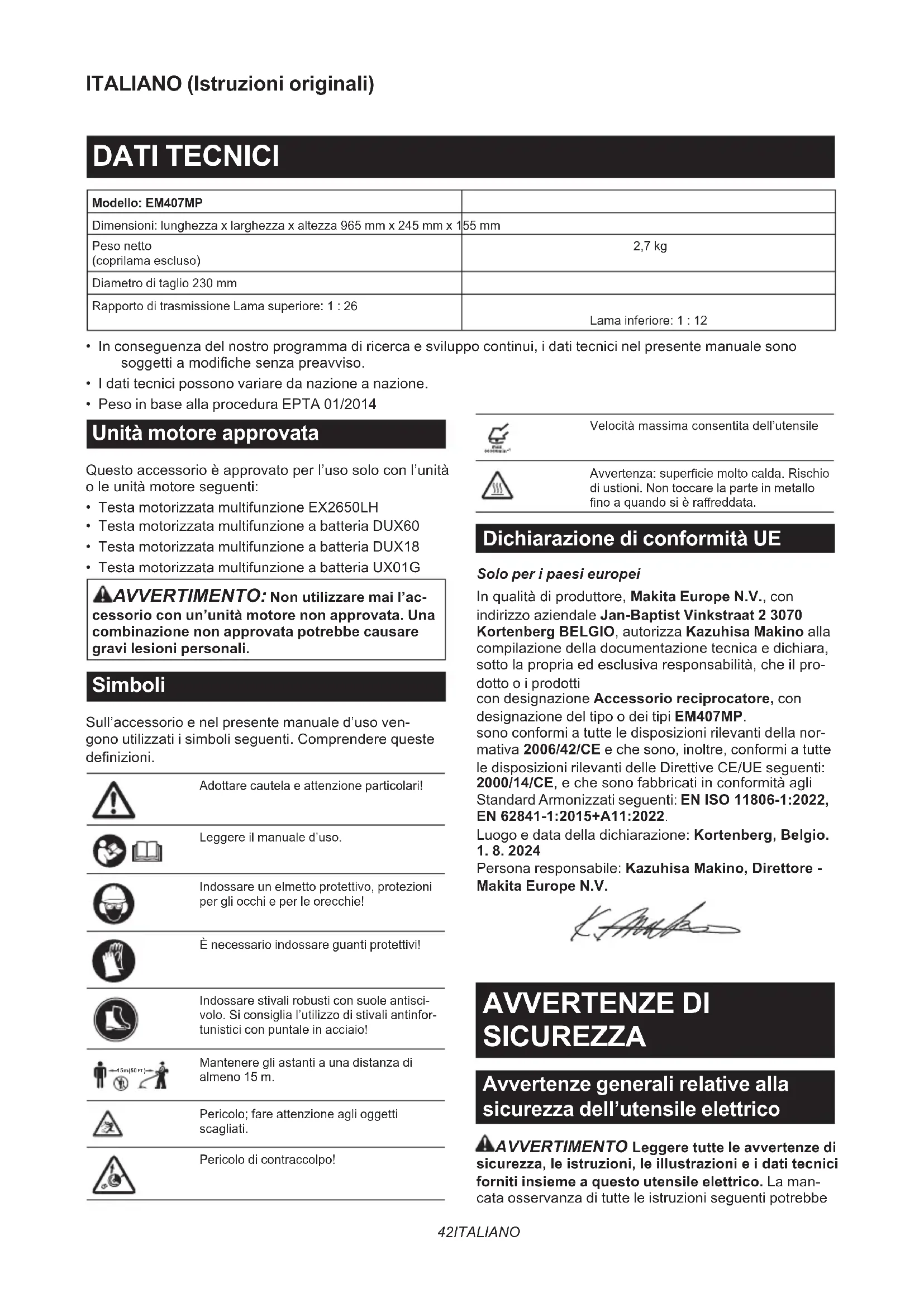 Mantenere gli astanti a una distanza di almeno 15 m.Pericolo; fare attenzione agli oggetti scagliati.Pericolo di contraccolpo!Velocitàmassimaconsentitadell’utensileAvvertenza:superciemoltocalda.Rischiodi ustioni. Non toccare la parte in metallo noaquandosièrareddata. Dichiarazione di conformità UE Solo per i paesi europei Inqualitàdiproduttore,Makita Europe N.V., con indirizzo aziendale Jan-Baptist Vinkstraat 2 3070 Kortenberg BELGIO, autorizza Kazuhisa Makino alla compilazione della documentazione tecnica e dichiara, sottolapropriaedesclusivaresponsabilità,cheilpro- dotto o i prodotti con designazione Accessorio reciprocatore, con designazione del tipo o dei tipi EM407MP. sono conformi a tutte le disposizioni rilevanti della nor- mativa 2006/42/CE e che sono, inoltre, conformi a tutte le disposizioni rilevanti delle Direttive CE/UE seguenti: 2000/14/CE,echesonofabbricatiinconformitàagli Standard Armonizzati seguenti: EN ISO 11806-1:2022, EN 62841-1:2015+A11:2022. Luogo e data della dichiarazione: Kortenberg, Belgio.