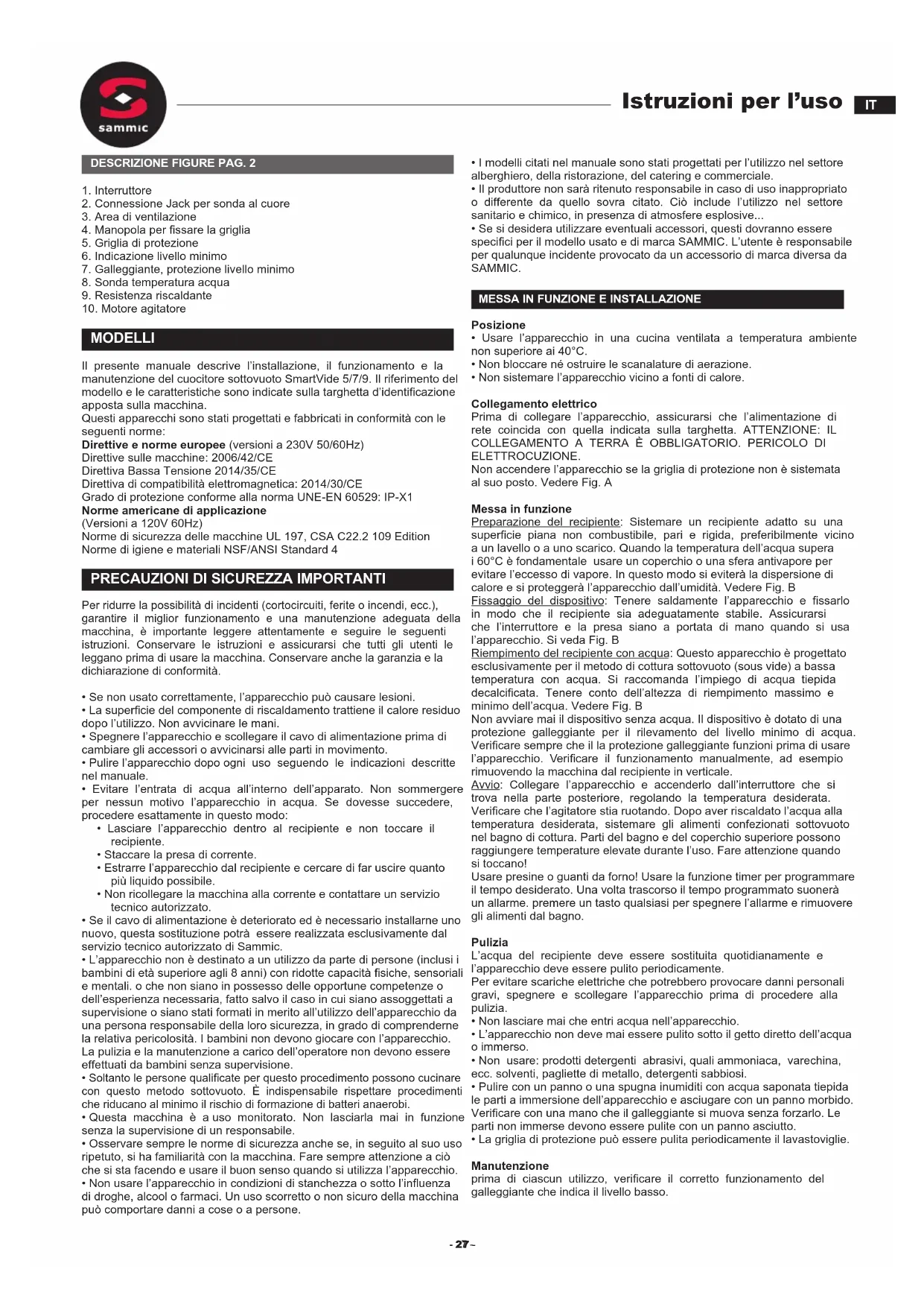 MODELLI Il presente manuale descrive l’installazione, il funzionamento e la manutenzione del cuocitore sottovuoto SmartVide 5/7/9. Il riferimento del modello e le caratteristiche sono indicate sulla targhetta d’identicazione apposta sulla macchina. Questi apparecchi sono stati progettati e fabbricati in conformità con le seguenti norme: Direttive e norme europee (versioni a 230V 50/60Hz) Direttive sulle macchine: 2006/42/CE Direttiva Bassa Tensione 2014/35/CE Direttiva di compatibilità elettromagnetica: 2014/30/CE Grado di protezione conforme alla norma UNE-EN 60529: IP-X1 Norme americane di applicazione (Versioni a 120V 60Hz) Norme di sicurezza delle macchine UL 197, CSA C22.2 109 Edition Norme di igiene e materiali NSF/ANSI Standard 4