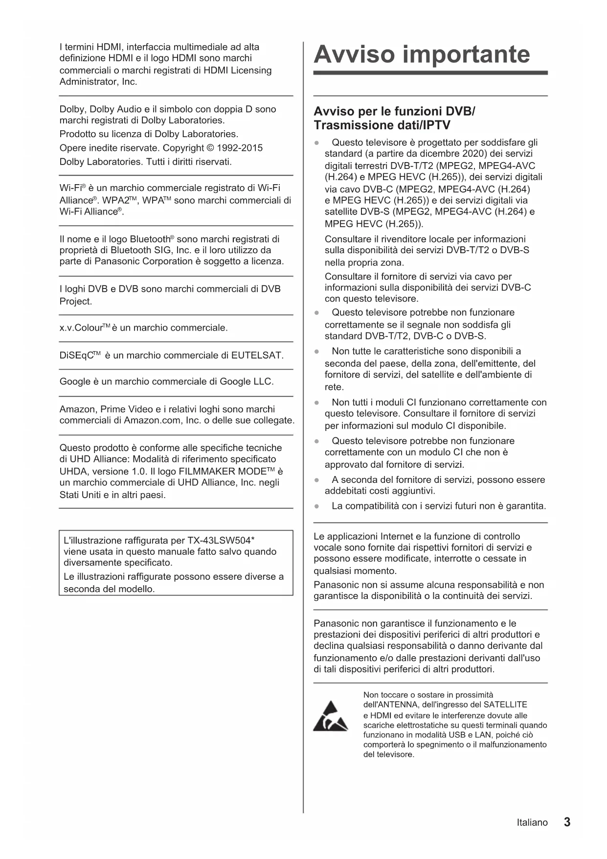 un marchio commerciale di UHD Alliance, Inc. negli Stati Uniti e in altri paesi. L'illustrazione raffigurata per TX-43LSW504* viene usata in questo manuale fatto salvo quando diversamente specificato. Le illustrazioni raffigurate possono essere diverse a seconda del modello. Avviso importante Avviso per le funzioni DVB/ Trasmissione dati/IPTV ● Questo televisore è progettato per soddisfare gli standard (a partire da dicembre 2020) dei servizi digitali terrestri DVB-T/T2 (MPEG2, MPEG4-AVC (H.264) e MPEG HEVC (H.265)), dei servizi digitali via cavo DVB-C (MPEG2, MPEG4-AVC (H.264) e MPEG HEVC (H.265)) e dei servizi digitali via satellite DVB-S (MPEG2, MPEG4-AVC (H.264) e MPEG HEVC (H.265)). Consultare il rivenditore locale per informazioni sulla disponibilità dei servizi DVB-T/T2 o DVB-S nella propria zona. Consultare il fornitore di servizi via cavo per informazioni sulla disponibilità dei servizi DVB-C con questo televisore. ● Questo televisore potrebbe non funzionare correttamente se il segnale non soddisfa gli standard DVB-T/T2, DVB-C o DVB-S. ● Non tutte le caratteristiche sono disponibili a seconda del paese, della zona, dell'emittente, del fornitore di servizi, del satellite e dell'ambiente di rete. ● Non tutti i moduli CI funzionano correttamente con questo televisore. Consultare il fornitore di servizi per informazioni sul modulo CI disponibile. ● Questo televisore potrebbe non funzionare correttamente con un modulo CI che non è approvato dal fornitore di servizi. ● A seconda del fornitore di servizi, possono essere addebitati costi aggiuntivi. ● La compatibilità con i servizi futuri non è garantita. Le applicazioni Internet e la funzione di controllo vocale sono fornite dai rispettivi fornitori di servizi e possono essere modificate, interrotte o cessate in qualsiasi momento. Panasonic non si assume alcuna responsabilità e non garantisce la disponibilità o la continuità dei servizi. Panasonic non garantisce il funzionamento e le prestazioni dei dispositivi periferici di altri produttori e declina qualsiasi responsabilità o danno derivante dal funzionamento e/o dalle prestazioni derivanti dall'uso di tali dispositivi periferici di altri produttori. Non toccare o sostare in prossimità dell'ANTENNA, dell'ingresso del SATELLITE e HDMI ed evitare le interferenze dovute alle scariche elettrostatiche su questi terminali quando funzionano in modalità USB e LAN, poiché ciò comporterà lo spegnimento o il malfunzionamento del televisore.Italiano